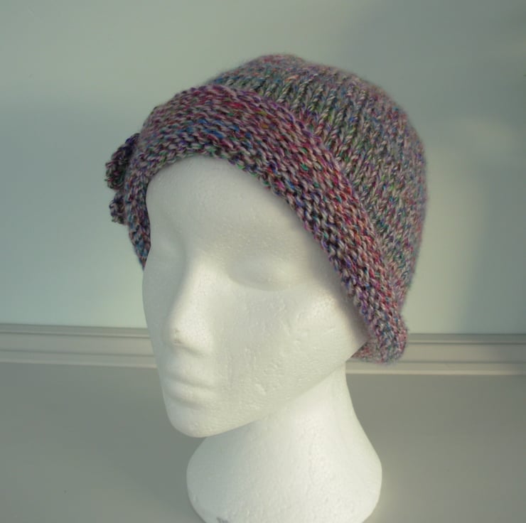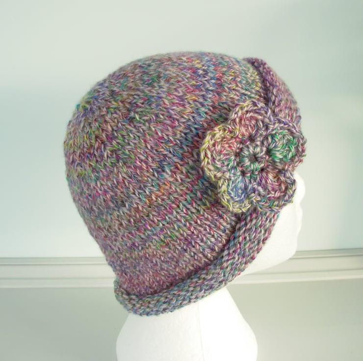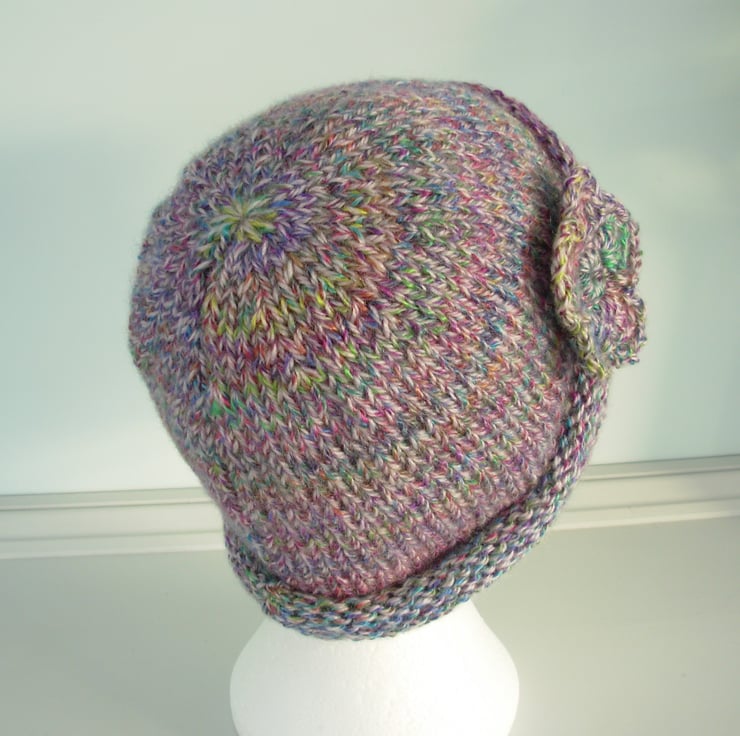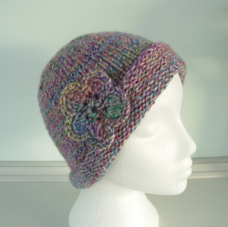 I've knitted this adults beanie hat in Wendy Festival chunky acrylic yarn and finished it with a crochet flower on the side.