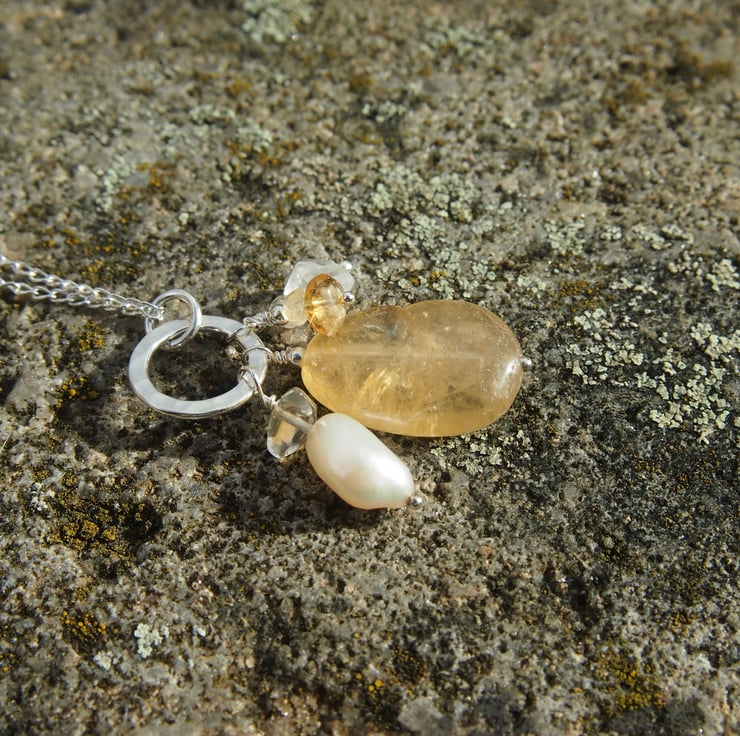 Pretty pendant with a single pale yellow oval citrine (2cm long) on a hammered sterling silver ring, set off by quartz crystals, tiny citrines in two other shades of yellow, and a single ivory freshwater pearl.