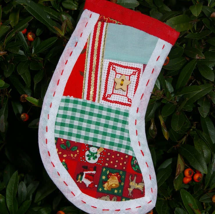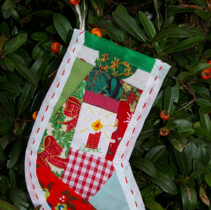 Trio of Christmas stocking decorations in patchwork with cross stitching, lace and ribbon. Each Christmas stocking is different, one has a cross stitch Christmas tree, one has a cross stitch candle while the third has a little wooden star button sewn onto a red, cross stitch square. Each stocking has been created with a variety of Christmas printed poly cotton fabric, plain green cottons and checked gingham cottons. Each one is surrounded in white cotton bias binding but has a different colour top band. All three stockings have a different colour ribbon hanging loop. All three are lined in a different colour fabric. One is lined in red and white check, one in plain red and the third in a green with white stripes.
