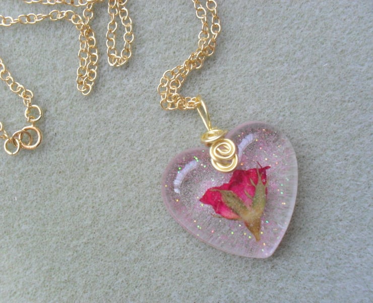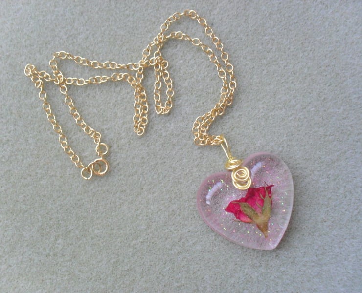 Rose has been set in to resin with some small glitter particles pendant has been attached to the chain with gold coloured wire with some swirls to add decoration.