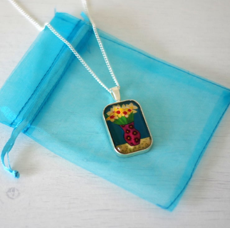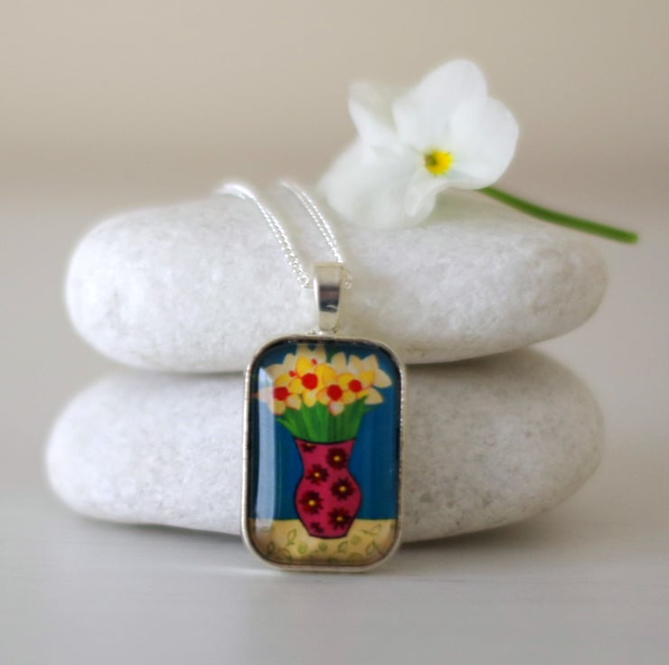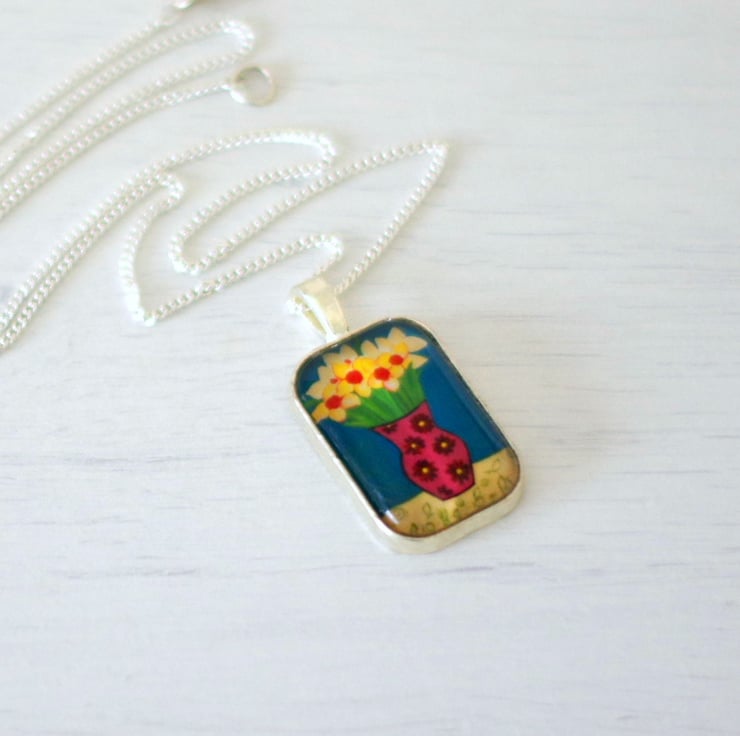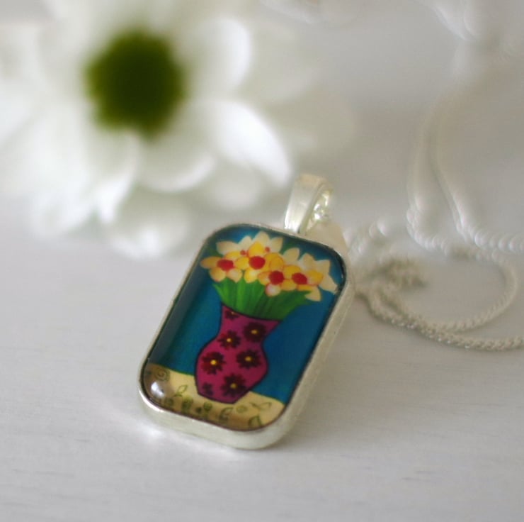 I made this teal pendant with yellow flowers using a mini print after one of my original paintings featuring a floral vase with daffodils against a teal background. The image is fixed after a glass cabochon with a magnifying effect. The pendant is approx 1.7" long and the silver chain is 34.5".