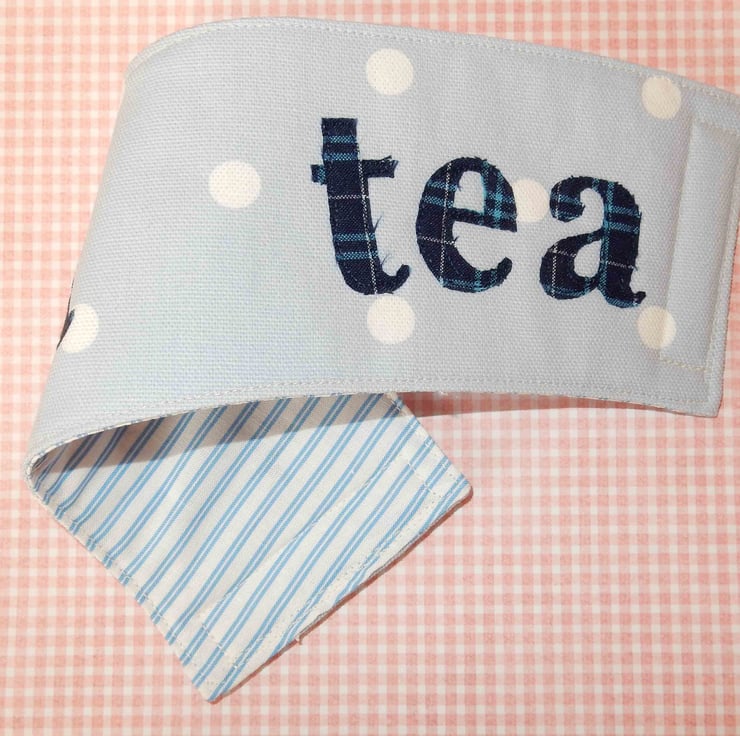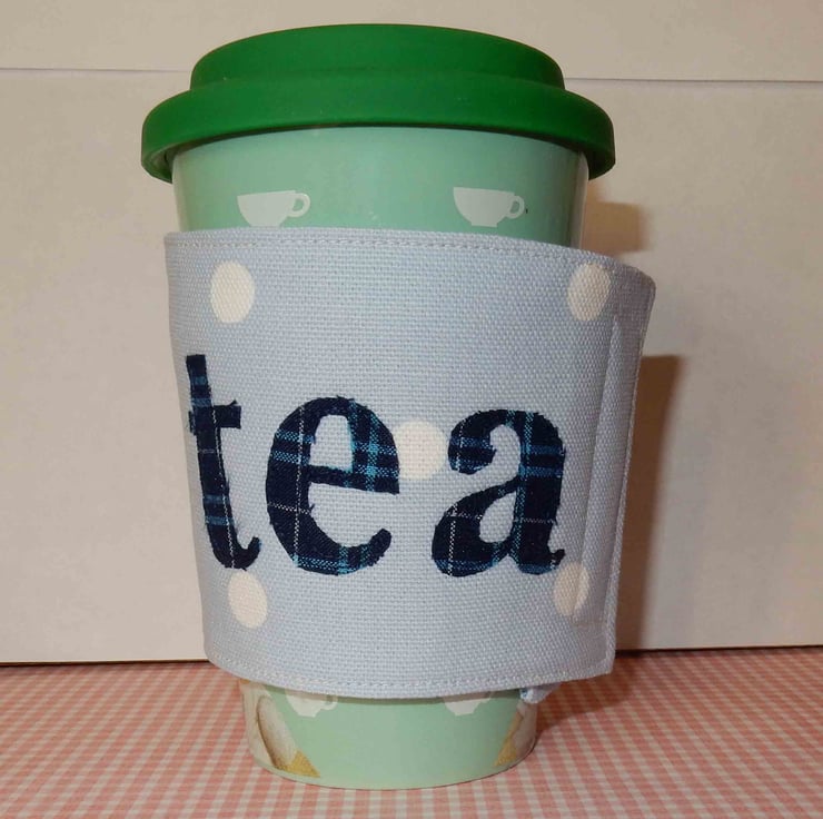 This cosy is designed to fit travel mugs similar to the one in the photo (mug not included). It is approximately 3.25 inches deep and fastens with Velcro. It is reversible with one side in a lovely blue and white spot cotton fabric with the word tea appliqued on it twice. There is a toning stripe on the reverse, and a layer of cosy wadding. to keep your tea warm