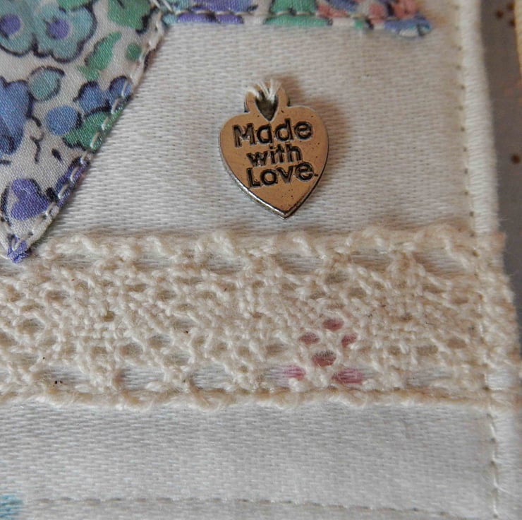 This traditional style needle case measures approx 4.5 x 3 inches and is made from a woven fabric with a Liberty print patchwork star appliqued on. It has a piece of cream lace and a pretty charm reading "Made with love". There is a pink butterfly on the back of the case. It is lined in toning cotton fabric and has four flannel leaves for your pins and needles. It is fastened with ribbon ties, which can be tied right round the case for protection in a bag.