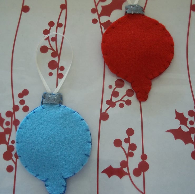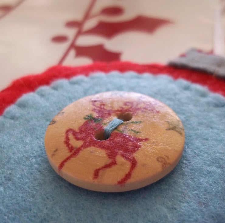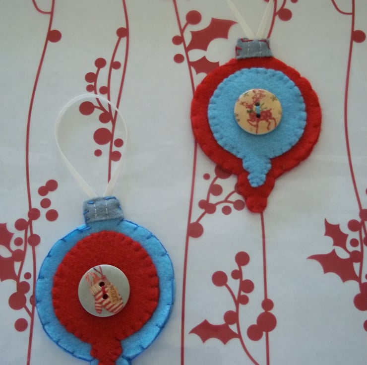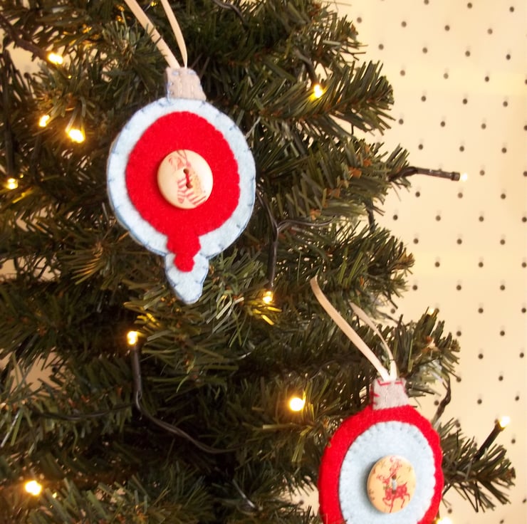 A lovely pair of felt decorations to add to your holiday trimmings. This pair of vintage shape inspired felt baubles are made in felt of red and on trend ice blue. On each a smaller shape in contrasting colour is stitched to the main body and the centre of this is adorned with a beautifully patterned wooden button, one has a striped mitten filled with sweets and the other has a reindeer and stars on. The top is shaped with grey felt bauble cap which has stitching detail, an extra touch with makes this item feel more like a bauble rather than just a felt shape. It has a narrow cream satin ribbon hanging loop and would look splendid on a tree or as part of any display around the house this Christmas season. Approximate measurements are just over two and half inches (6.5cm) at the widest place and just under four inches long (10cm) excluding hanging loop and six and a half inches (16cm) with the loop. They are produced flat so they are ideal for posting and take up next to no storage space, so I’m sure you can justify added them to your Christmas collection. This item is designed as a decorative item and is not a toy.