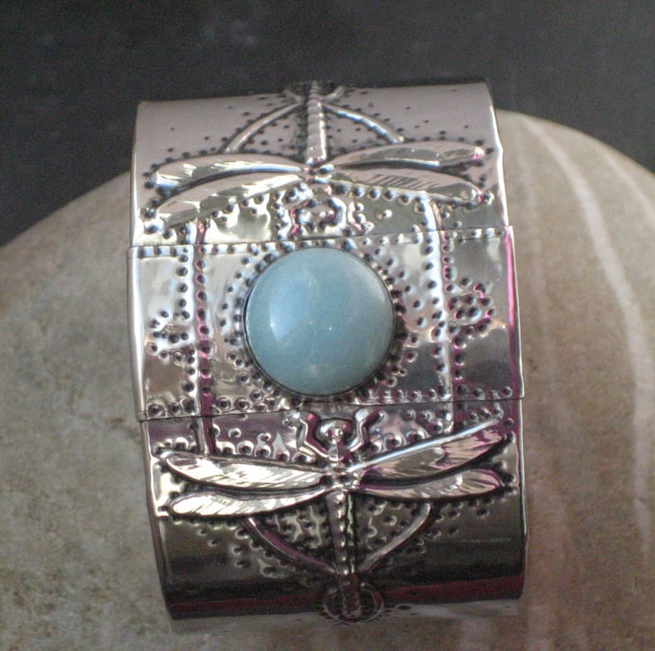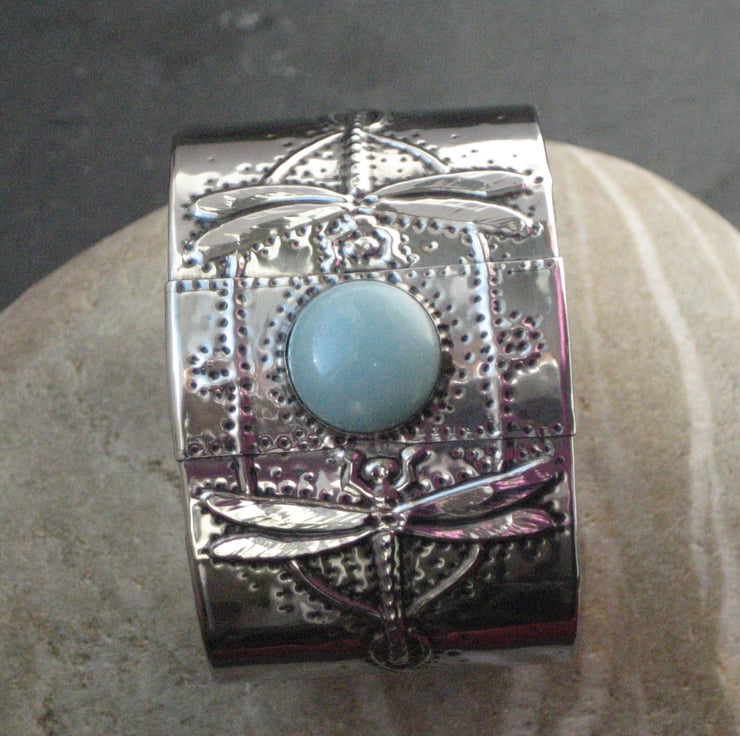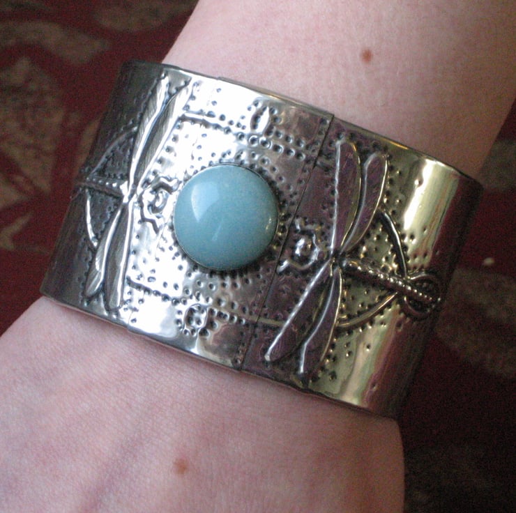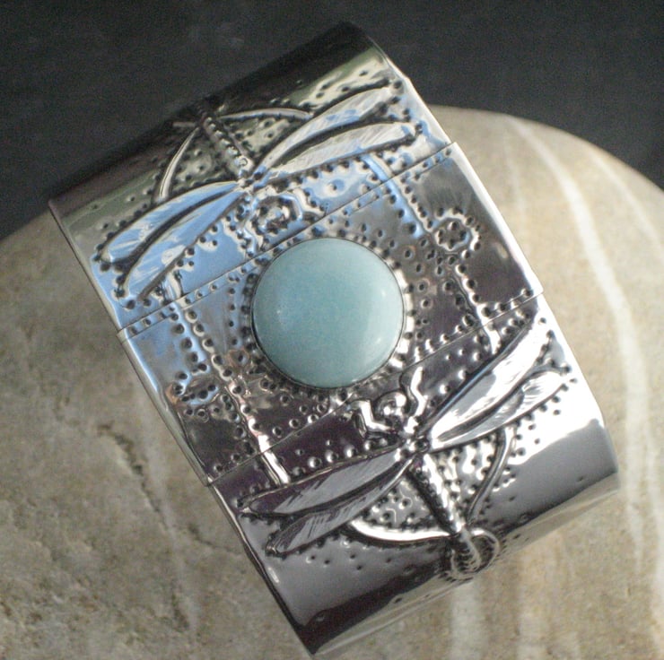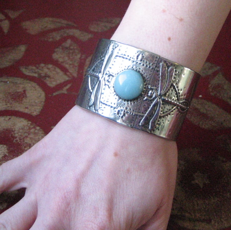 Silver dragonfly pewter amazonite cuff bracelet in Art Nouveau style. This unique dragonfly bangle has been made by hand using shiny modern lead-free pewter and features a green amazonite cabochon gemstone. Measuring 155mm in length in and incomplete circle, it is 38mm deep and light in weight. Hand crafted in the UK, it would be a perfect gift for a woman for a special occasion such as a Birthday, Christmas or 10th Wedding Anniversary.