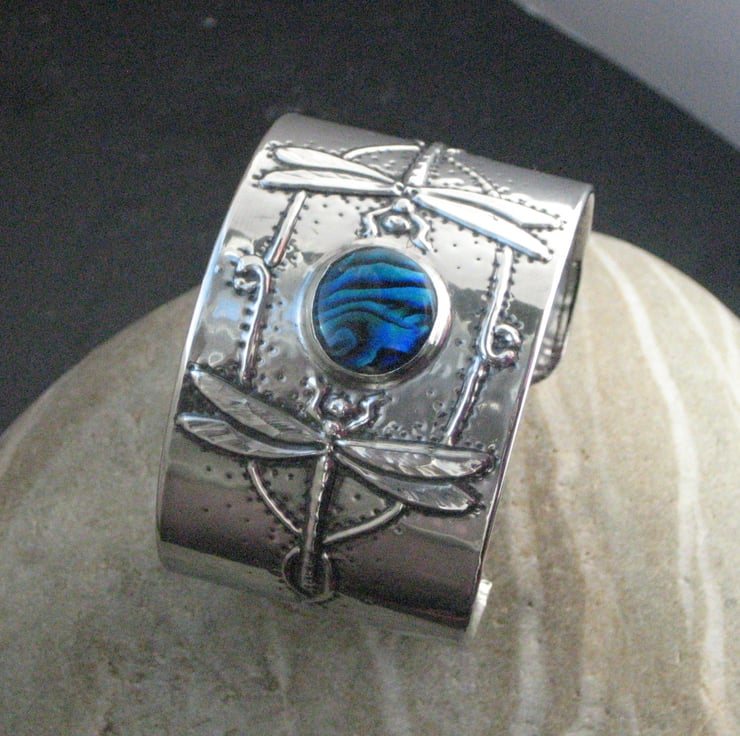 Silver pewter hand-crafted bracelet with embossed dragonflies. This stunning cuff bangle has been handmade from shiny lead-free pewter and features a beautiful blue paua shell cabochon. It is 38mm deep and 158mm long and has a space for sliding the hand in sideways. Exclusive to "The Owl and the Pussycat", this lovely cuff would be a perfect gift for a woman for a special occasion such as a 10th Wedding Anniversary, Birthday or Christmas. Please note that the cabochon will not be the one in the photograph but it will be the same gorgeous colours.