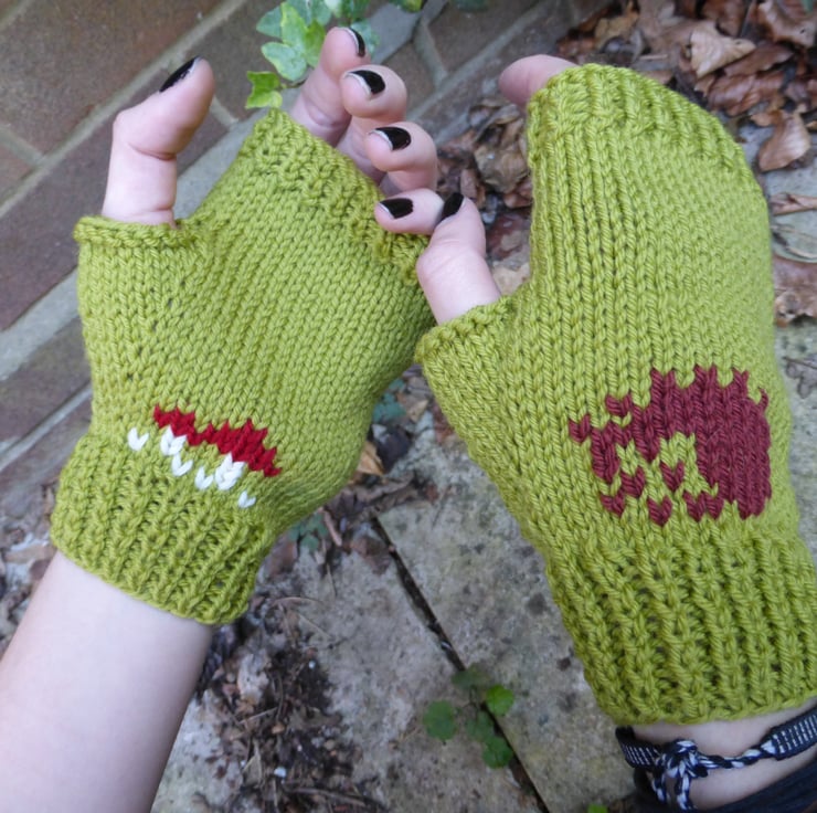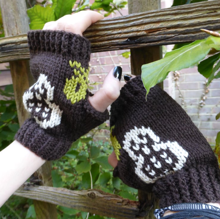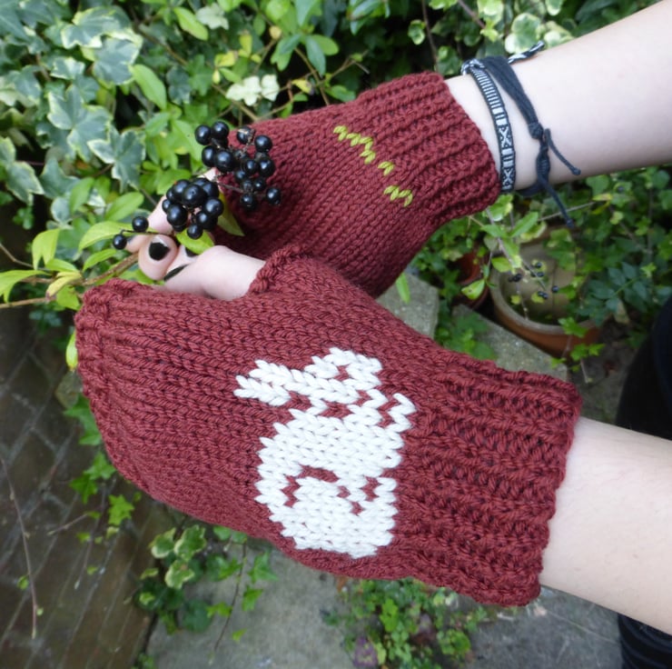 These woodland themed fingerless mittens feature a little woodlander animal motif on the back of the hand and some woodland fare on the palm. Choose between squirrels and nuts, hedgehogs and mushrooms, rabbits and grass or owls and leaves.