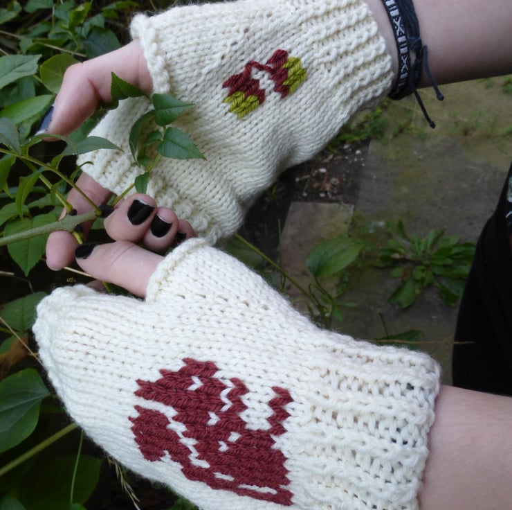 The mittens are knit flat on two needles with a side seam, using DK weight yarn. The motifs are added after knitting using Swiss darning (Duplicate stitch), however they could be added whilst knitting using the intarsia method.