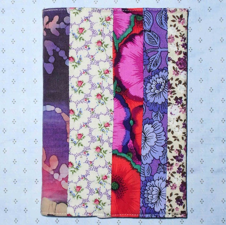 This is an A6 (approx. 6x4 inches) week to view fabric covered diary. It is covered in pretty fabrics in a patchwork style, in purple colour tones. Complete with standard week to view diary, refills are easily available, for the next year. The cover is lined, interfaced and removable.