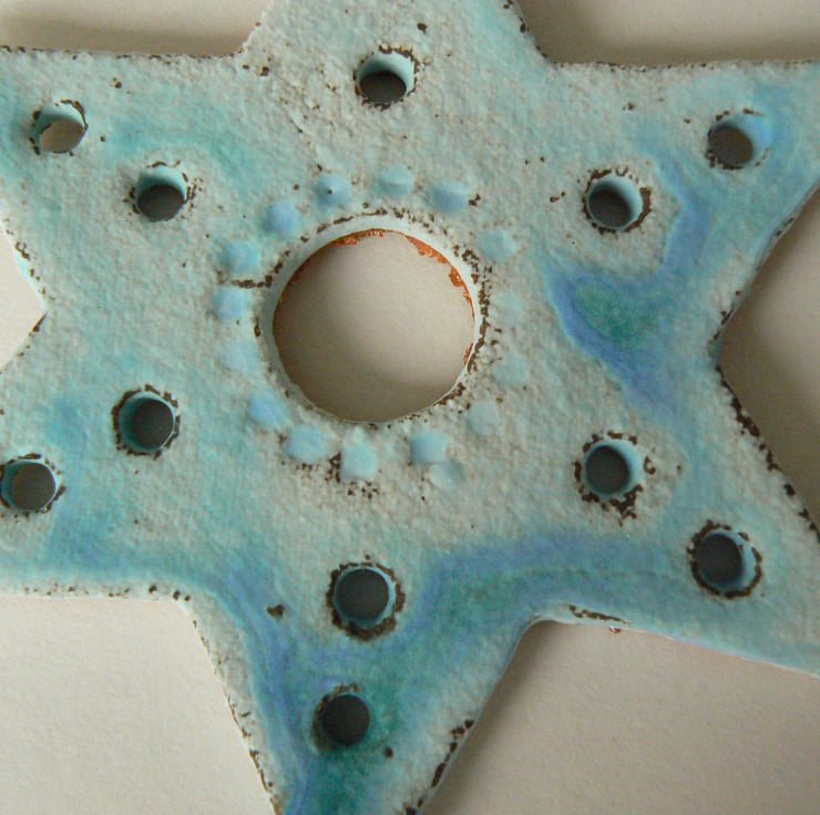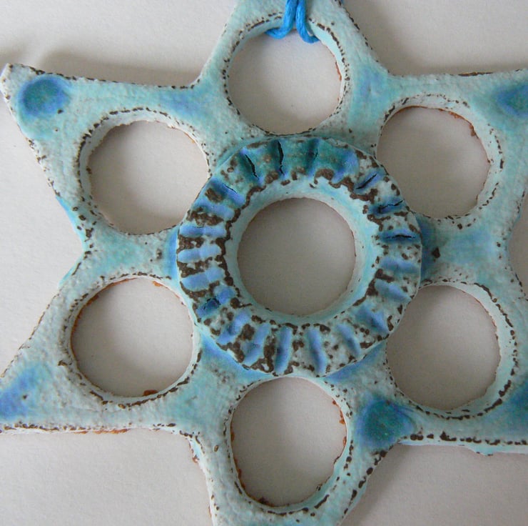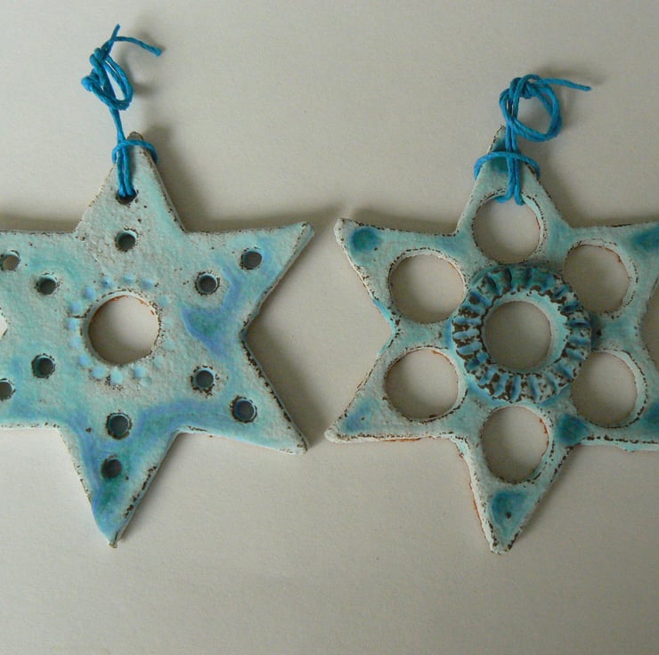 Christmas Stars. A pair of stoneware fired ceramic stars. Made from a buff rustic clay with a turquoise glaze they have been threaded with a turquoise hemp string.