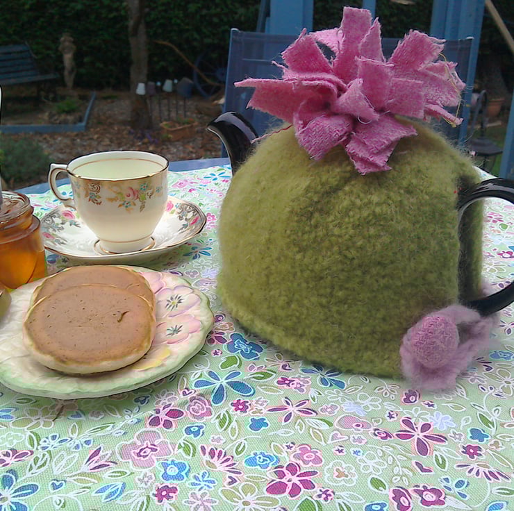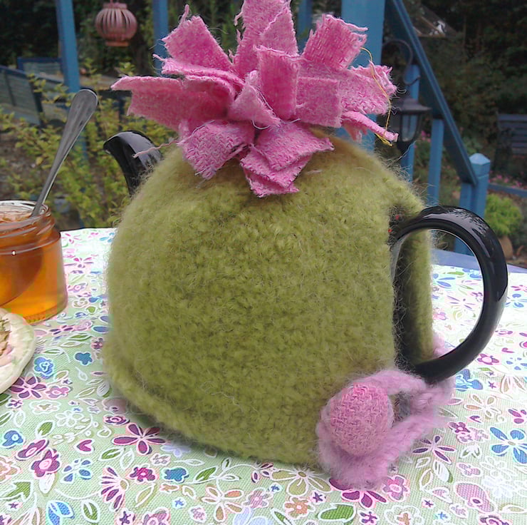 Green and pink look great together, so I decided to combine these colours in this cute tea cosy. The body of it is felted wool with the trim made from Harris tweed.