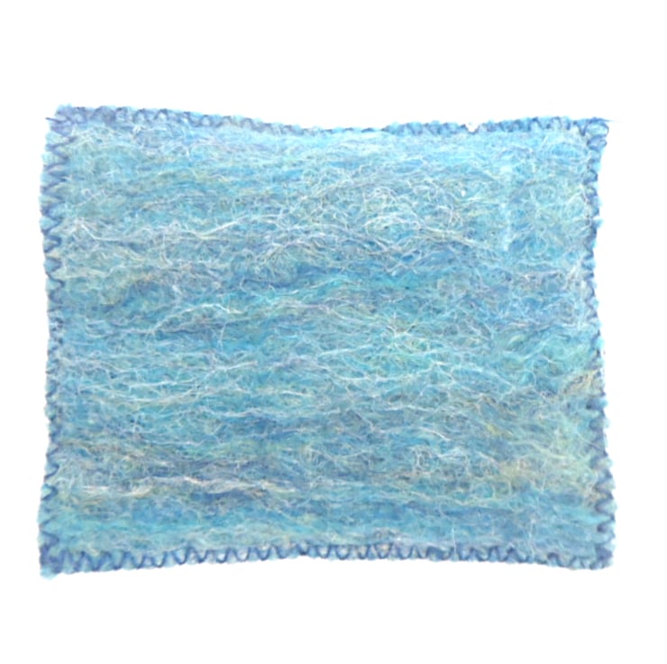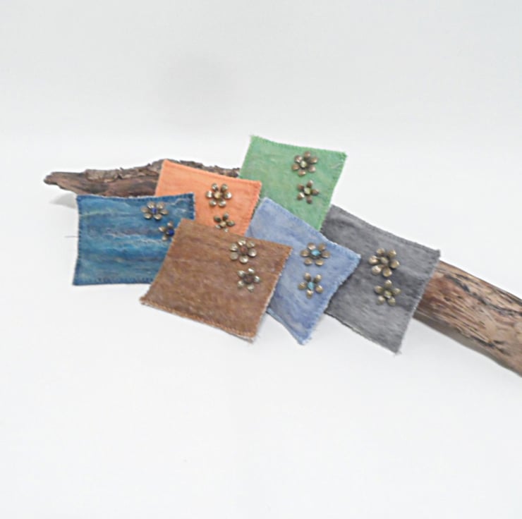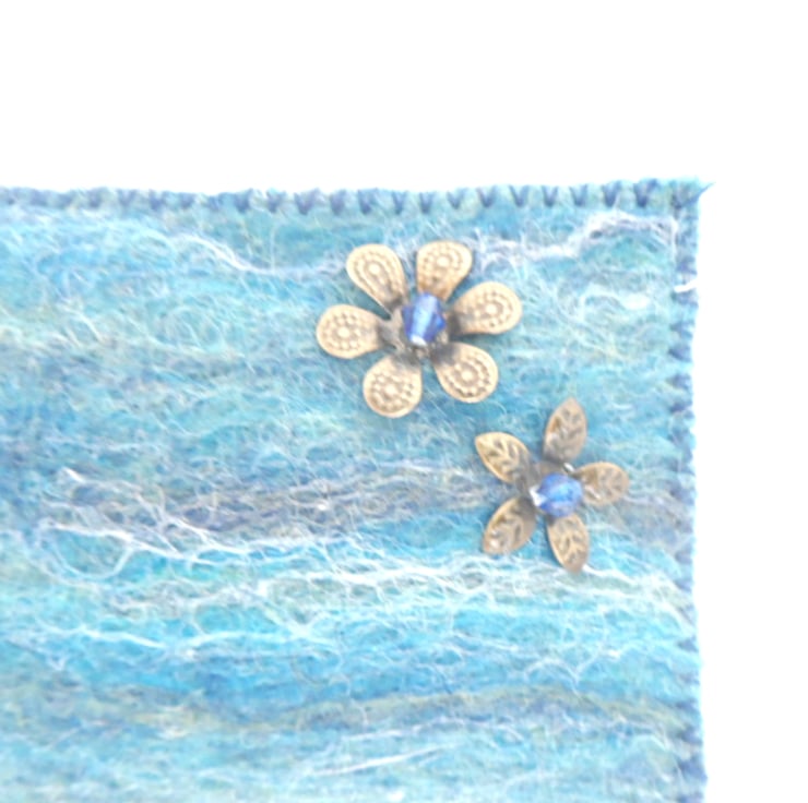 Made from handmade felt in a blue and green blend of merino wool this lavender pillow or sachet has been filled with dried Norfolk lavender. Two pretty flowers have made using antique bronze effect petals and acrylic bicone beads have been hand sewn onto the front as decoration. The bag measures approximately 8cm (3") x 6.5cm (2.5").