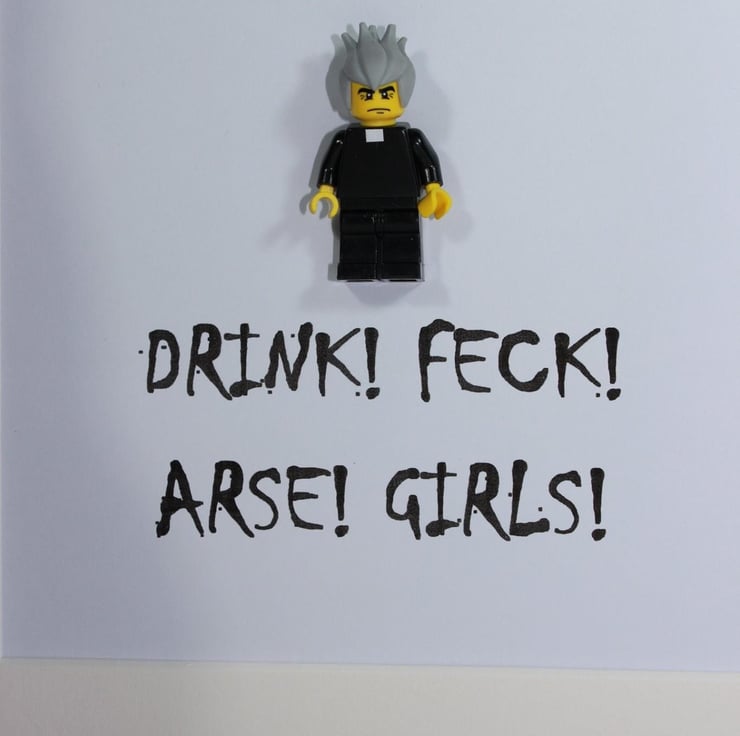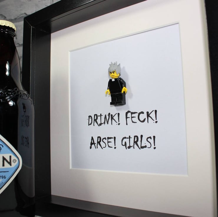 This frame is a must for any fan of the cult TV comedy Father Ted... The deep box frame features a custom Lego minifigure of Father Jack with his memorable quote of "Drink! Feck! Arse! Girls!" printed underneath.