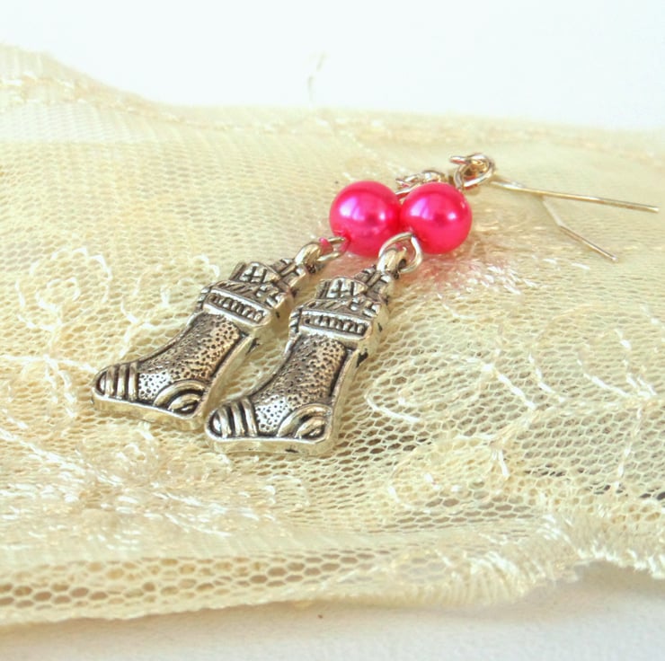 Made with a vivid pink faux pearl and a tibetan silver Christmas stocking charm, these earrings would make a great Secret Santa gift.