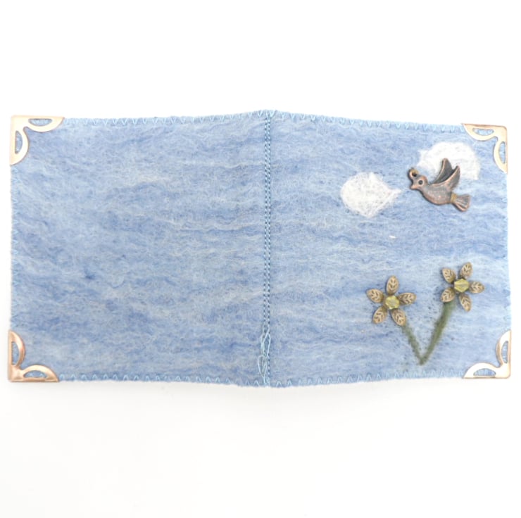 The outer cover of the needle case is made from hand felted blue merino wool. On the front cover decoration has been added using needle felting techniques and the addition of an antique bronze effect bird charm and two flowers formed from antique bronze effect petals and acrylic bicone beads.