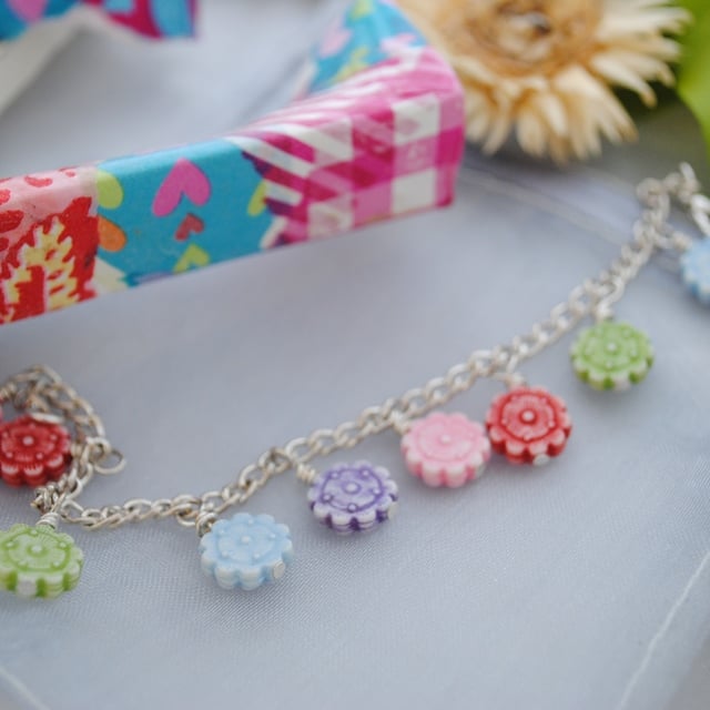 The bracelet features a collection of pastel coloured flower charm beads hand-wrapped to the silver bracelet