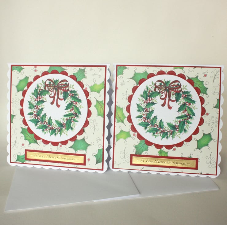 Pack of 2 Christmas cards featuring an image of a Holly wreath layered onto a rich, scalloped, red card and then onto a holly leaf background.