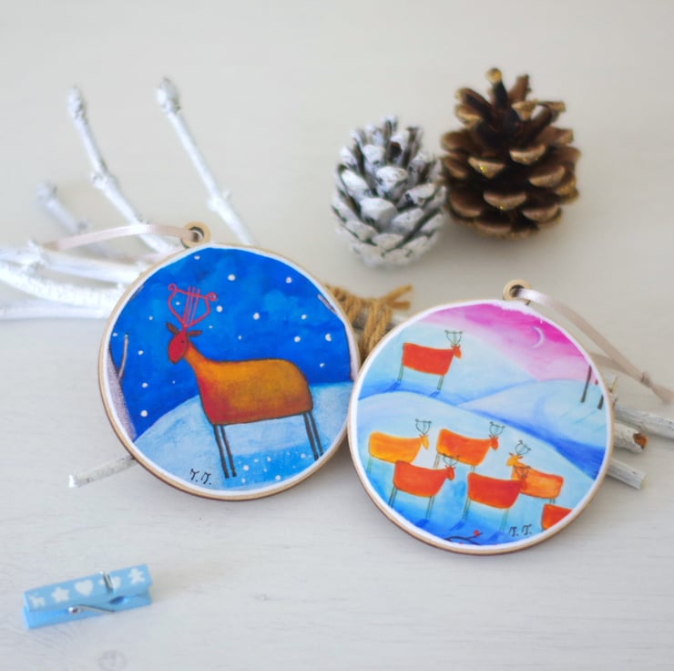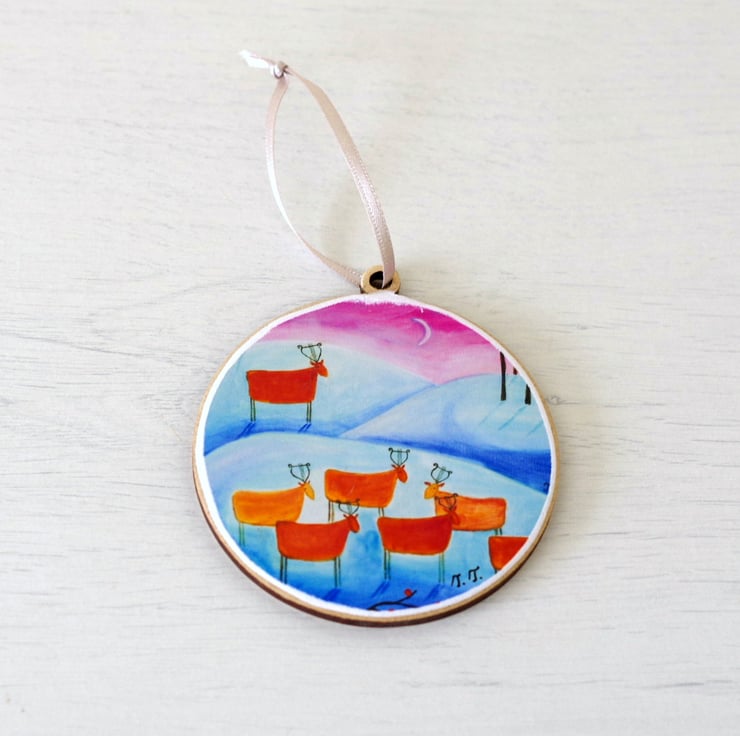 I made this Christmas hanging decoration using a mini print after my original winter painting 'Icy Hills'. The image is mounted on a wooden globe. The ornament measures 3" x 3" round.