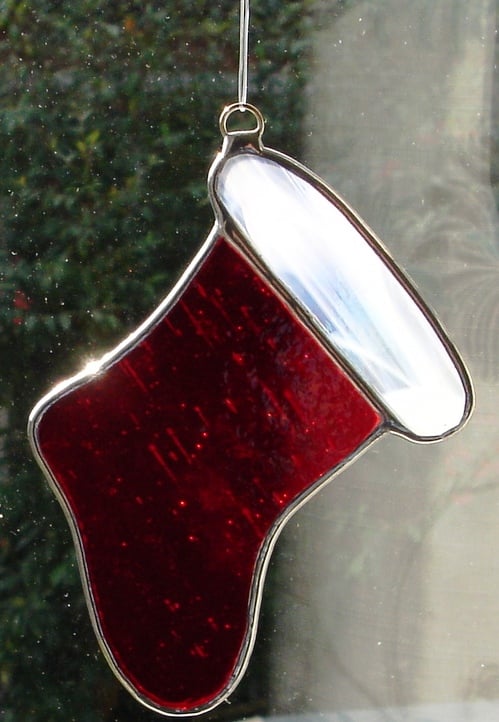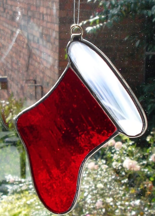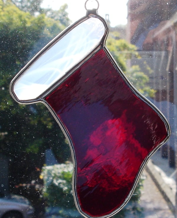 Our stained glass Santa's Boot will make a great addition to your Christmas Tree decorations. The boot is cut from ruby red glass and trimmed with white. It is hand-crafted using the Tiffany copper foil method and edged with a raised solder bead. To finish we polish the boot and add a hand tied loop so it is ready to hang in place.
