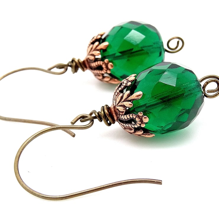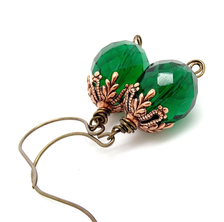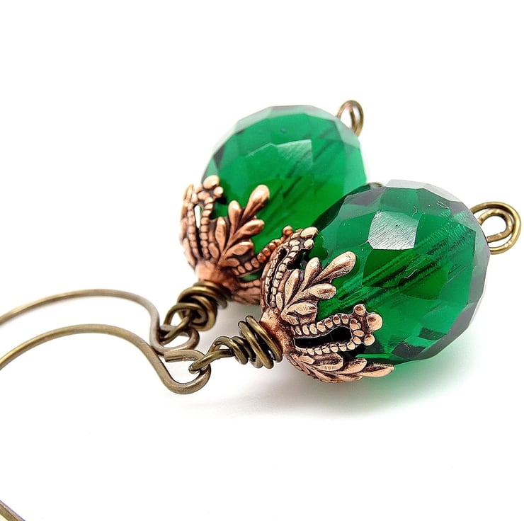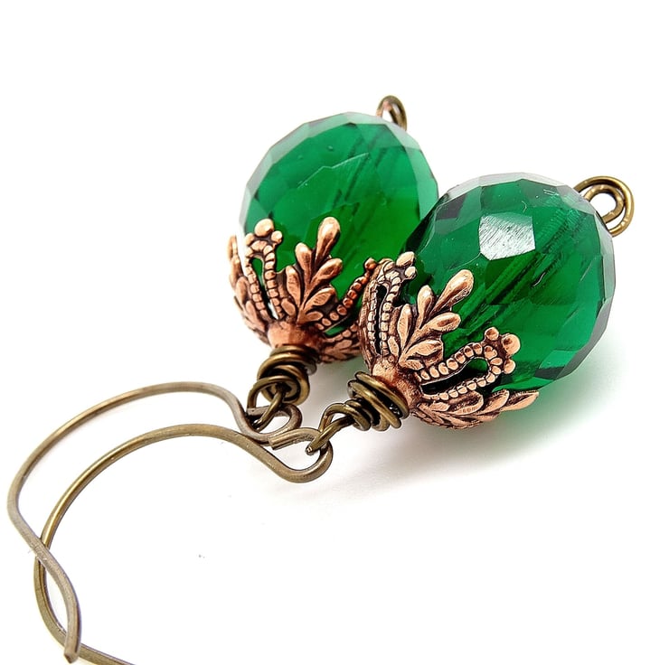 These are just lovely with a vintage style look. They are made with 14mm faceted czech glass beads in a beautiful emerald green. I have added antique bronze coloured filigree bead caps which have a very intricate design. The earrings measure just over 4cm (1.3/4") from top of earwires. The earwires are vintaj brass and nickel free. As all of the items in my shop are unique, individual pieces made by myself, these are the earrings you will receive. They will arrive gift wrapped in tissue paper and a organza bag.