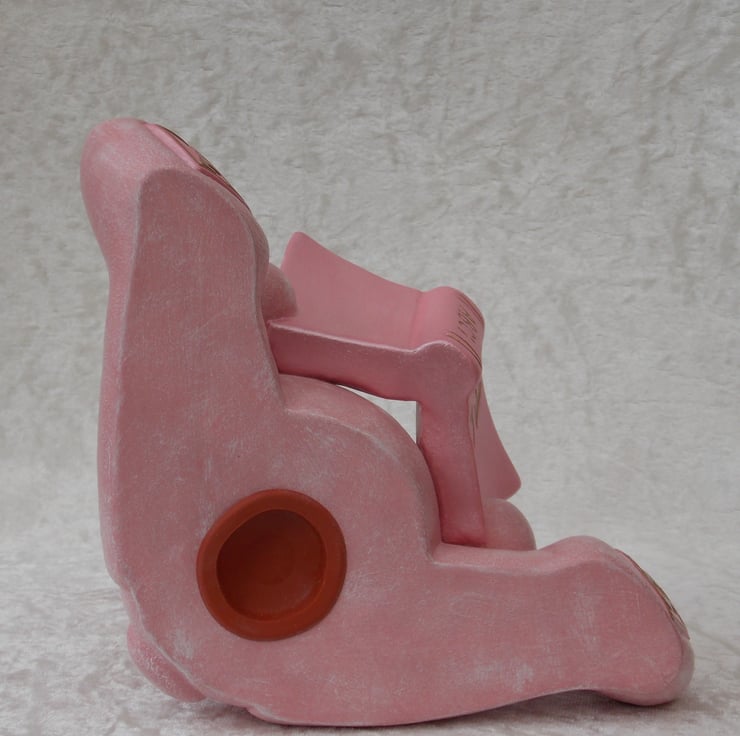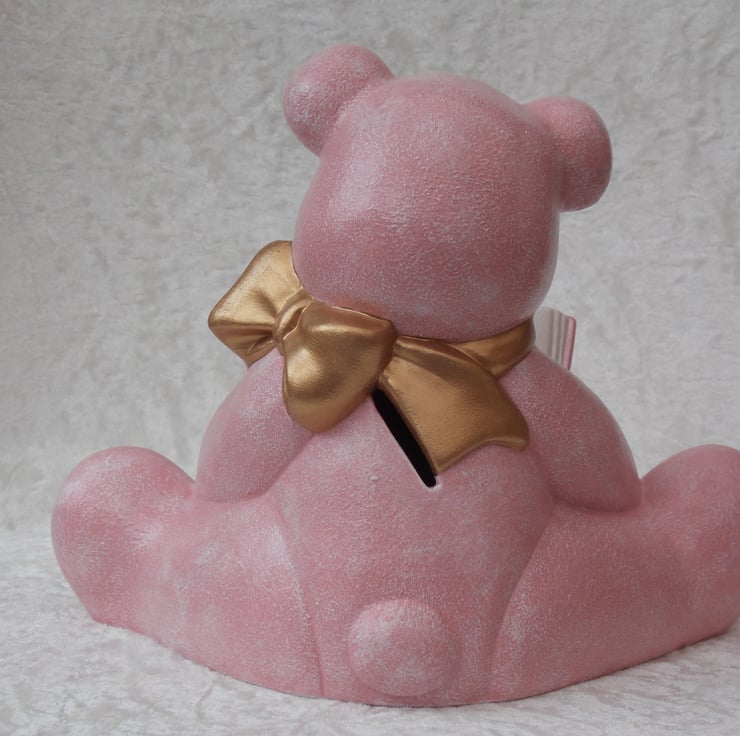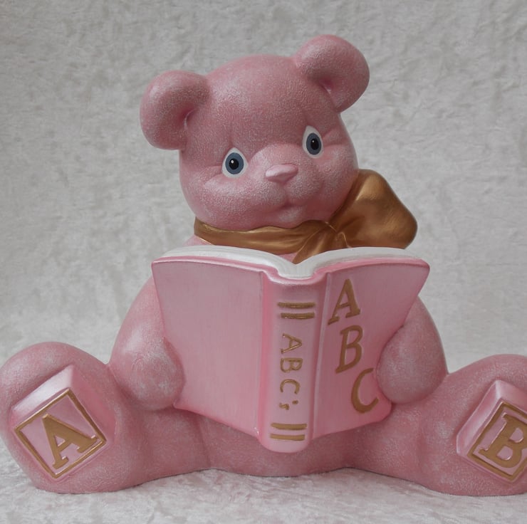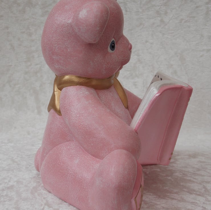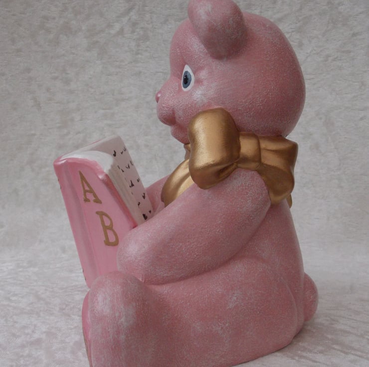 I have for sale a ceramic money box, which was hand painted by myself. It is a sitting figurine teddy bear, in a lovely baby pink colour. It is wearing a large gold coloured bow and reading an alphabet book, which is also in pink and gold colours. There is a large slot in its back for any money, also included is a rubber bung in the bottom of it. This would make a lovely addition to any child's bedroom shelf, or perhaps given as a gift.