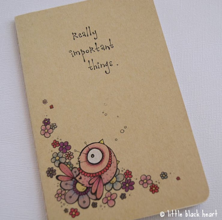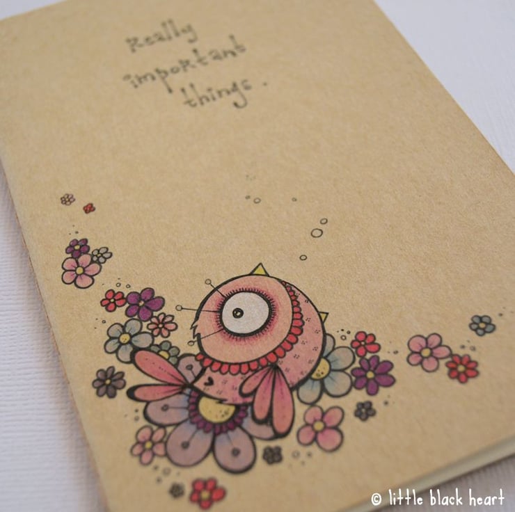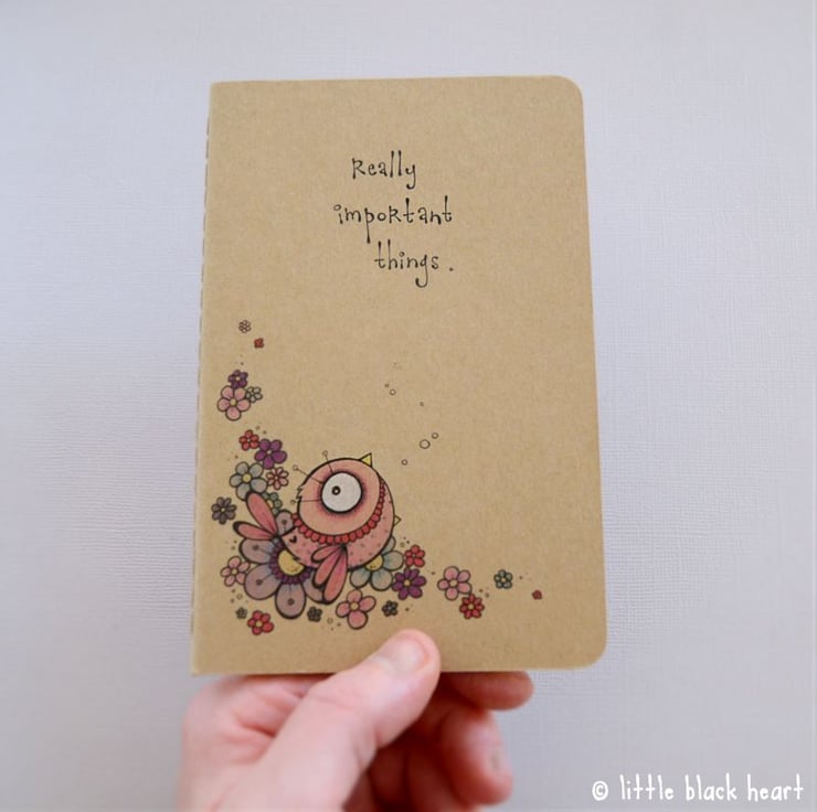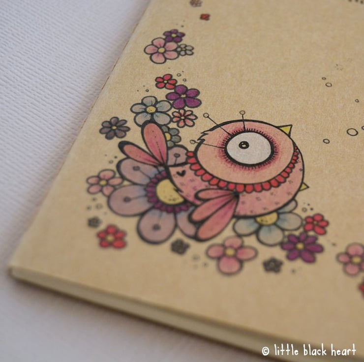 this pocket notebook features a sweet little bird sitting amongst some pink and purple flowers.
