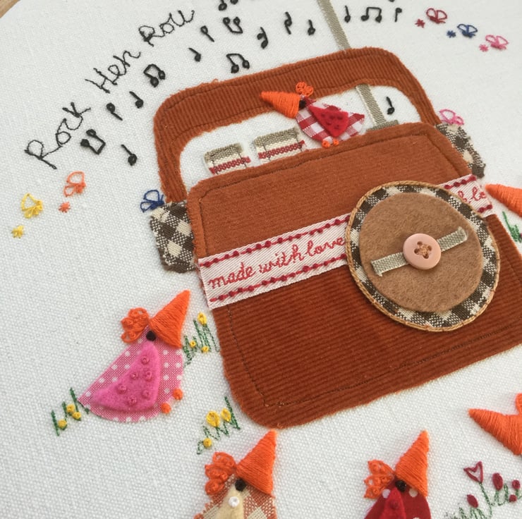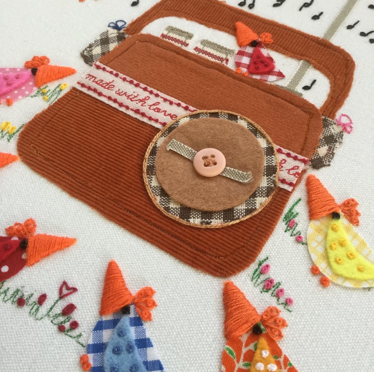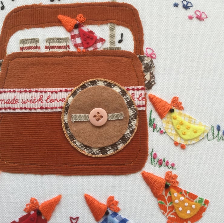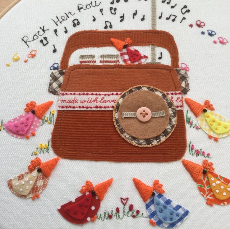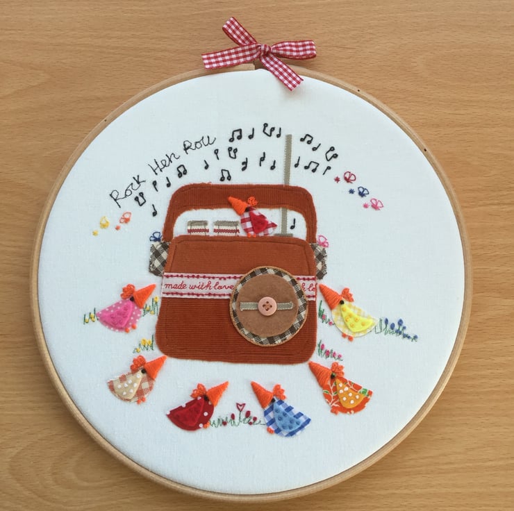 This 10" embroidered hoop art is made using a mixture of free machine and hand embroidery. Classic fabrics of gingham and dots are used alongside cord which I have chosen for the radio. My chickens like to listen to music floating above made with hand stitches, kept company by colourful butterflies.This would be an ideal gift for a radio listener and chicken lover!