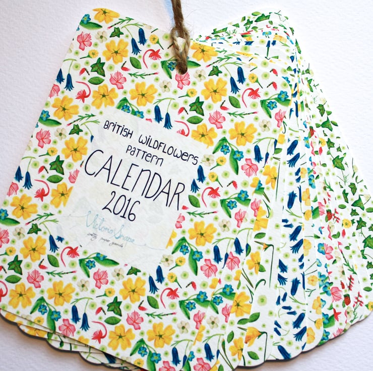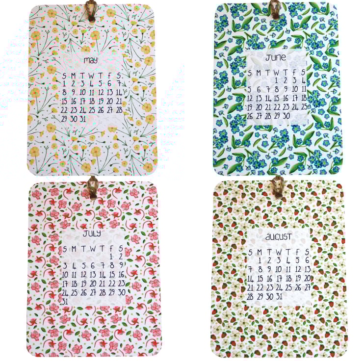 The calendar includes 12 A6 size prints, approximately 105x148mm with rounded corners and featuring my original watercolour patterns of British wildflowers for each month, with hand lettered months and dates.