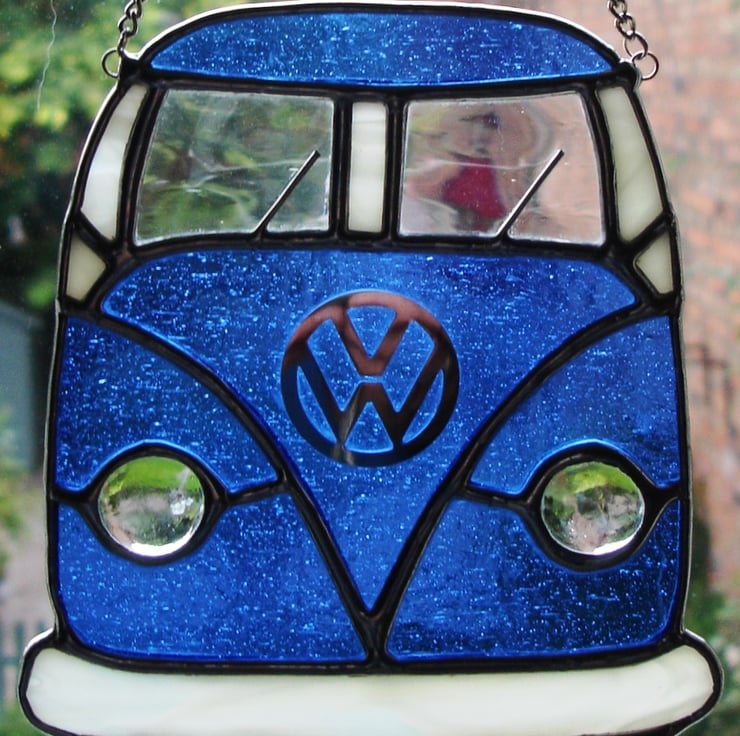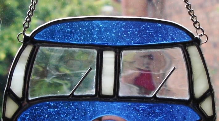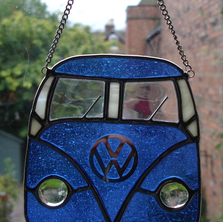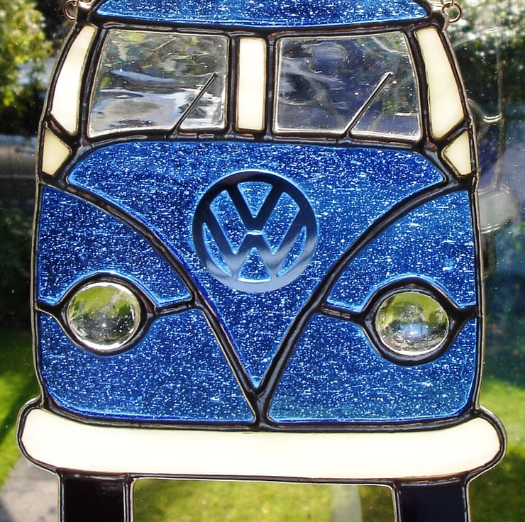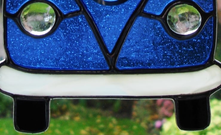 Our stained glass camper van makes the perfect gift for enthusiasts. We have used the Tiffany copper foil method of stained glass making. Each piece of glass is cut by hand and shaped using a grinder. The edges of the glass are wrapped in copper foil tape which is burnished to the glass. The pieces of glass are then soldered together using a fine raised solder bead. We have used Kokomo restoration glass in blue and white wispy glass for the bumper and windscreen frame. We have hand polished the finished piece and added a chain so that it is ready to hang in position.