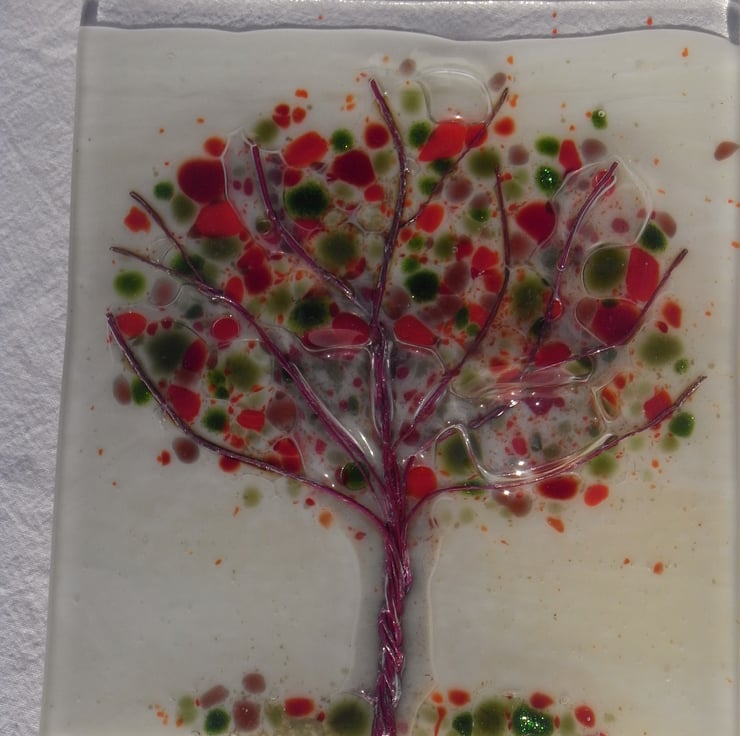 Fused glass panel. Tree is created in various thicknesses of copper wire, Autumnal colours of glass are added, including sparkles, on top of a cream background. Clear glass is added on the top and fused together.