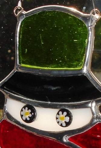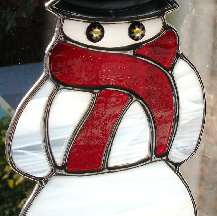 This year why not add our stained glass snowman to your Christmas decoration collection. He is hand-crafted using the Tiffany copper foil method and edged with a fine rounded solder bead. Snowman is made from wispy white glass and we have used Kokomo restoration glass for the scarf and hat and Millefiori glass beads for his eyes. The finished snowman has been polished to add that extra sparkle and we have added a hand tied loop so he is ready to hang in position.