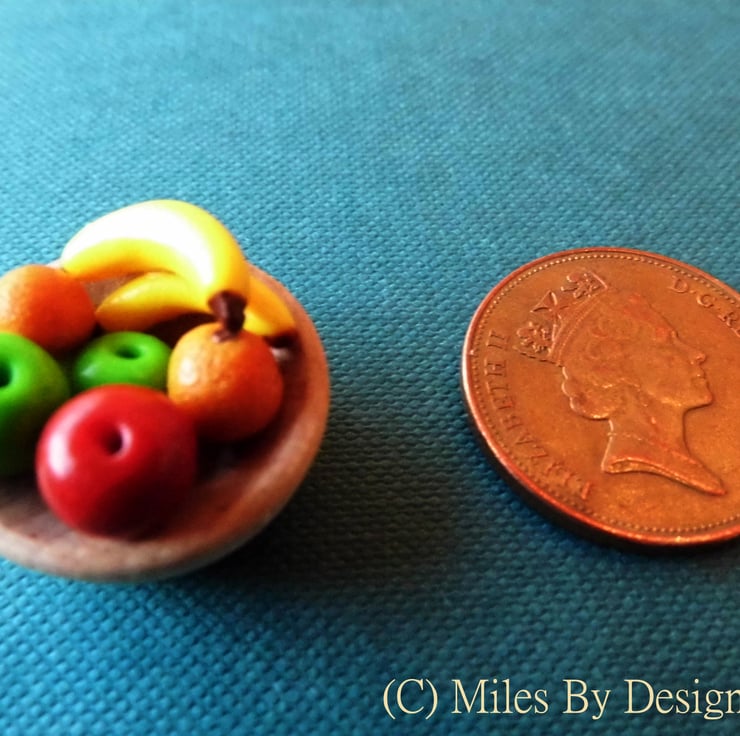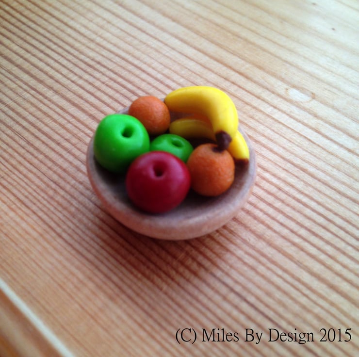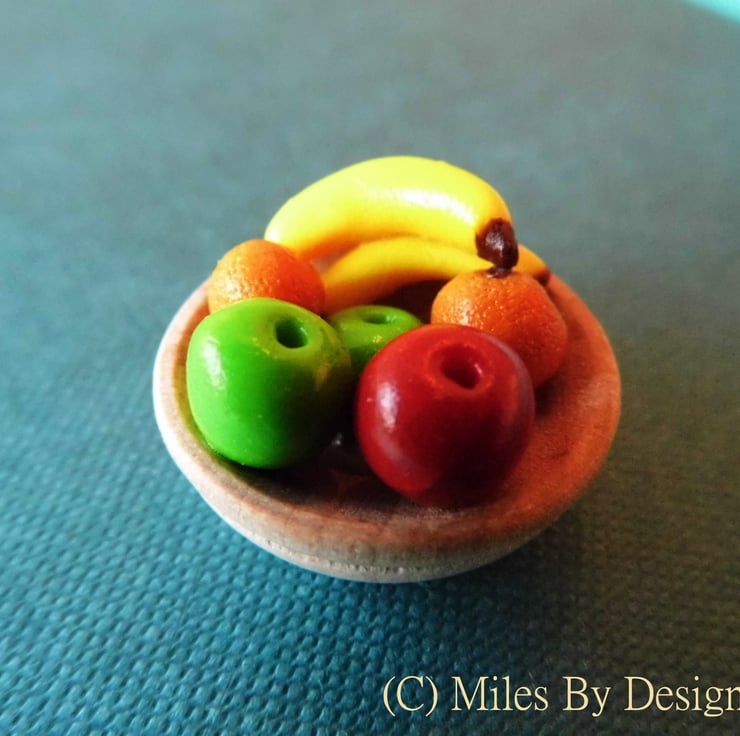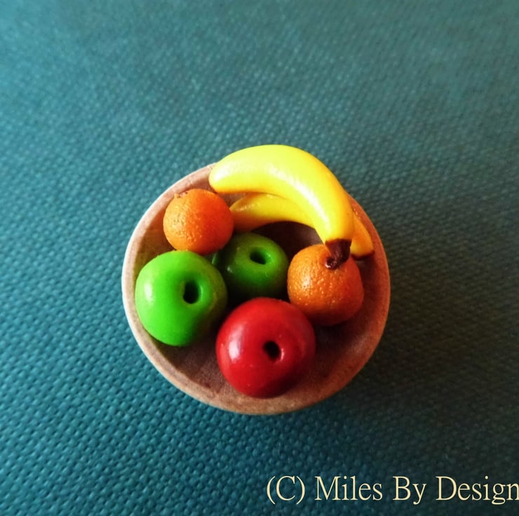 Hand crafted from polymer clay, it contains all the fruit bowl regulars such as green apples, red apples, bananas and oranges all coming together in a wooden bowl.