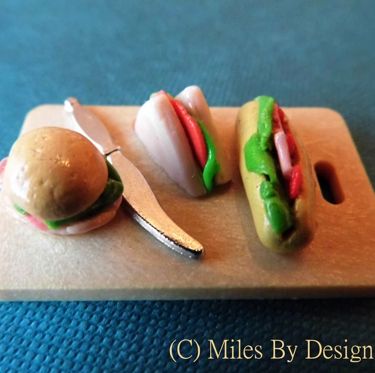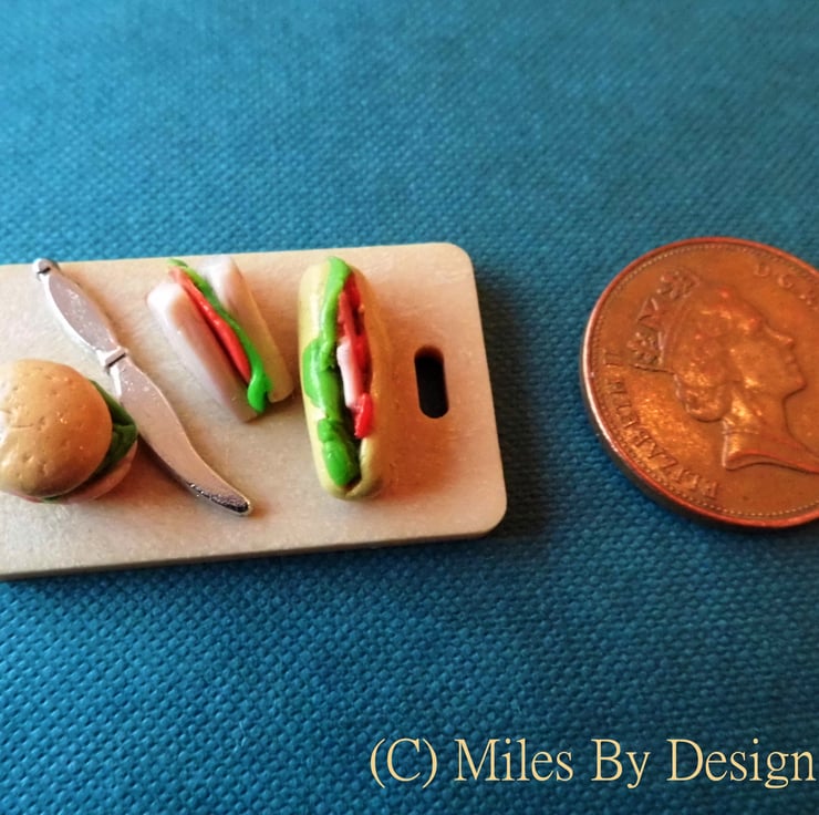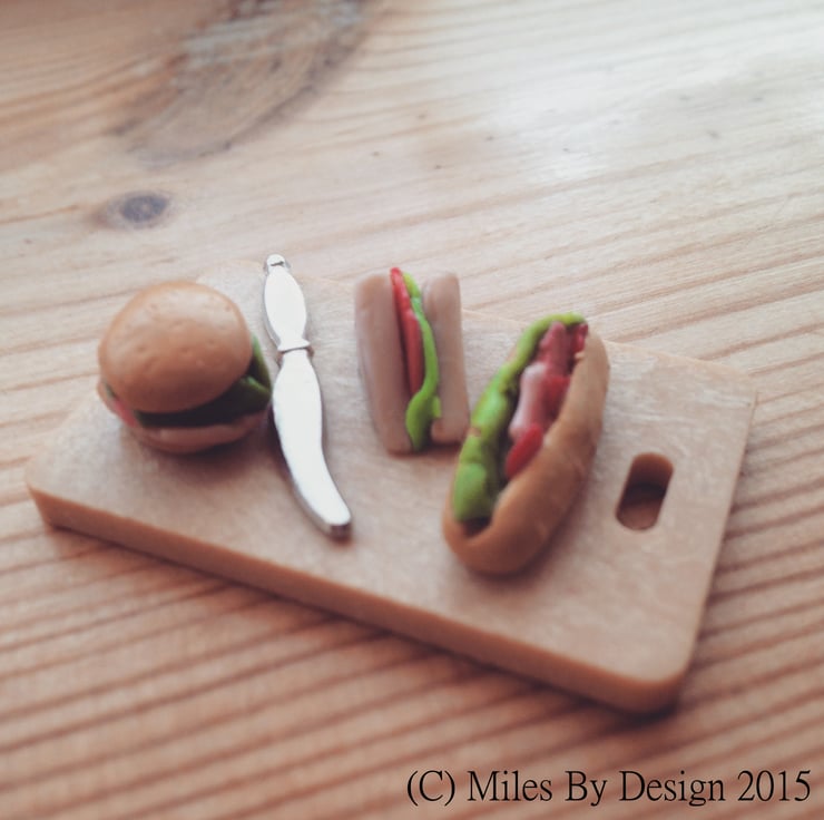 Food Glorious food! This board of lunchtime delectables is hand crafted from polymer clay and displayed on a plastic chopping board with metal knife embellishment.