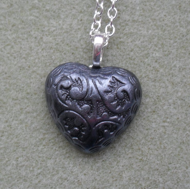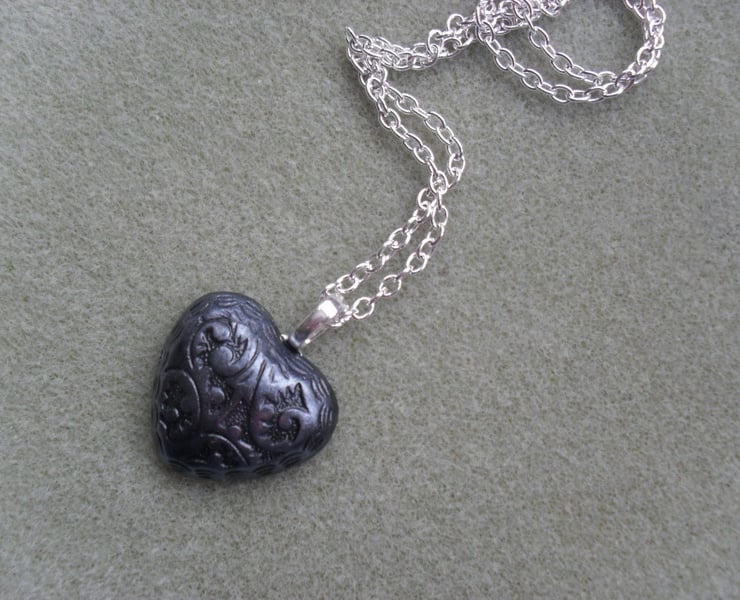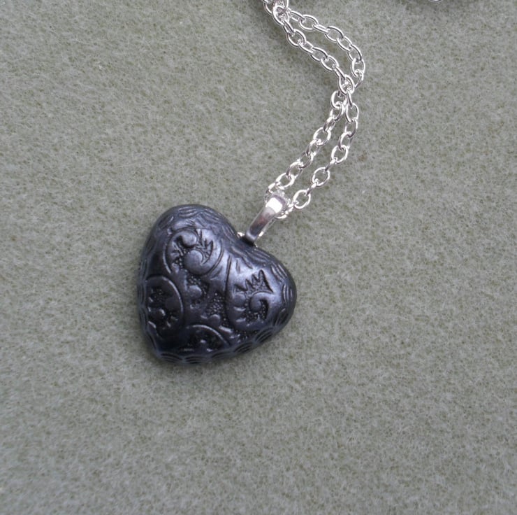 Handmade black polymer clay pendant which has had a mica powder in silver applied to the surface on the front which gives a metallic finish and has had a coat of polymer clay glaze to seal.