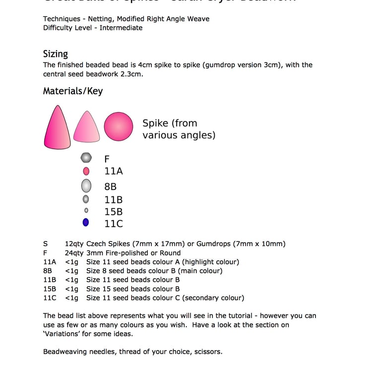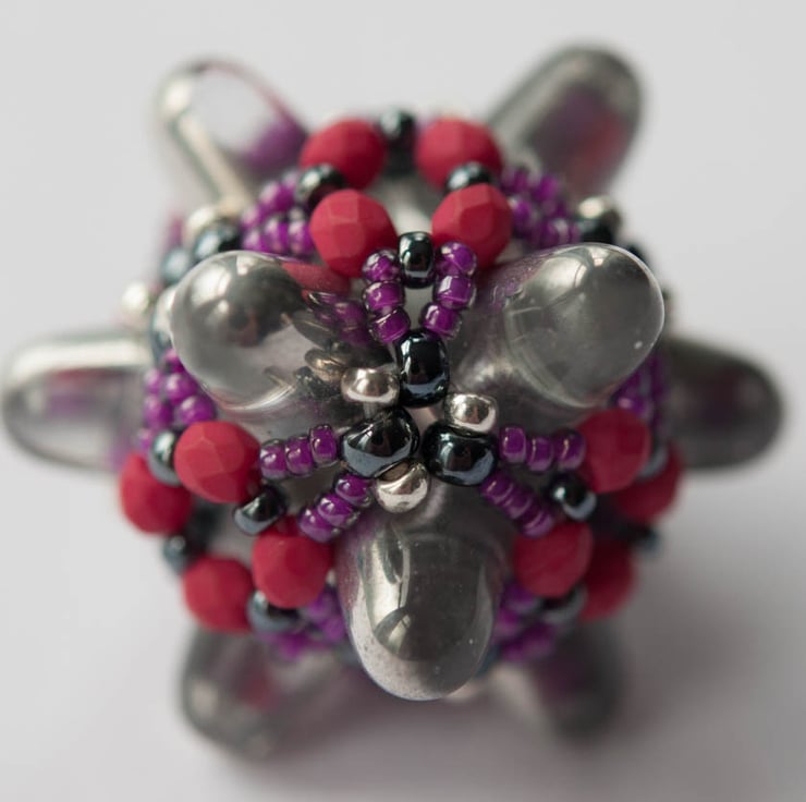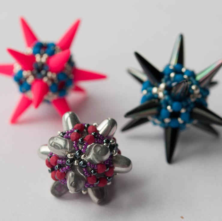 A tutorial for a wonderful exuberant ball of Czech spike beads or Czech gumdrops, held in place by a network of seed beads and Czech fire polished beads. The beaded ball is hollow and self supporting, and can be beaded in a couple of hours by a good intermediate beader using Netting and Modified Right Angle Weave.