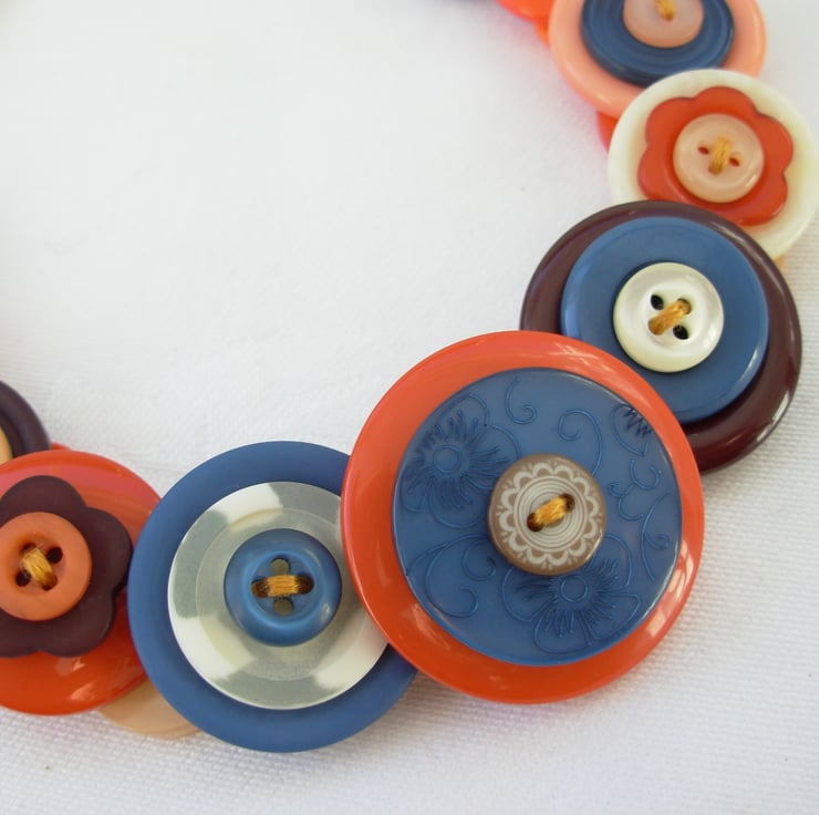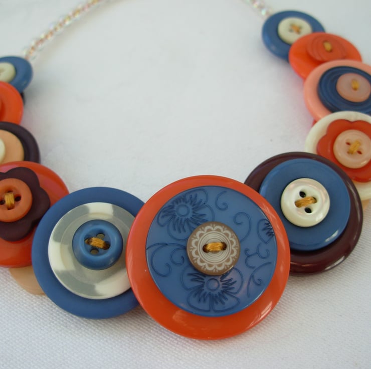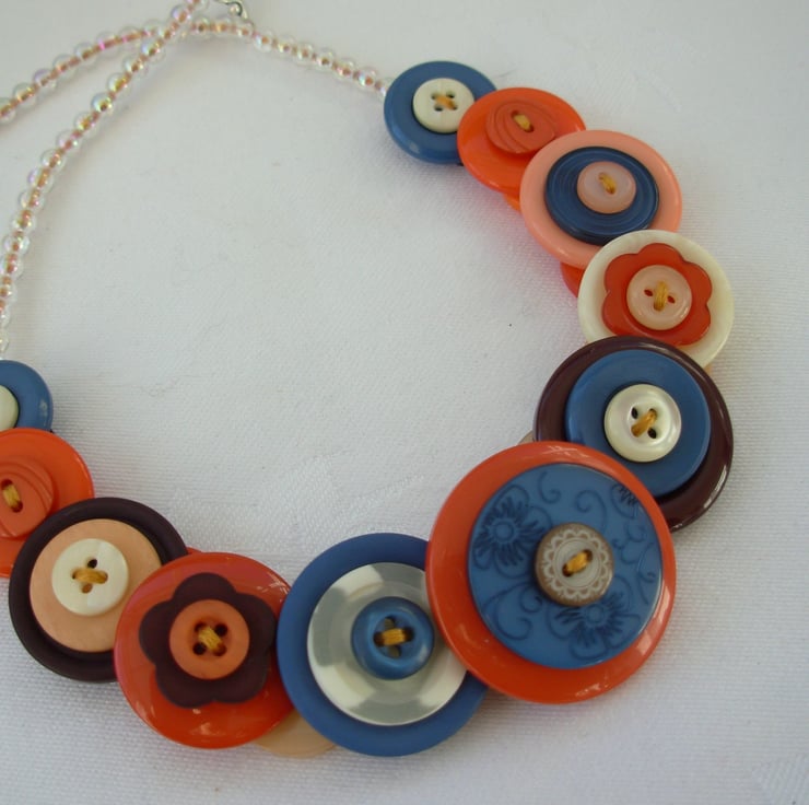 I've made this layered and stacked button necklace from assorted orange, blue, cream and brown buttons. It is threaded and knotted with embroidery thread and finished with little clear Aurora Borealis beads and a silver plated toggle clasp.
