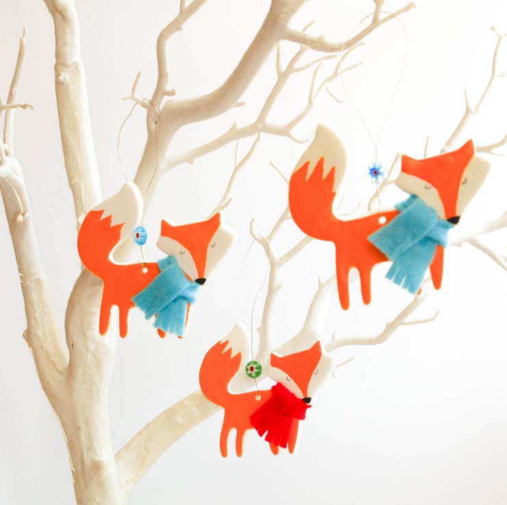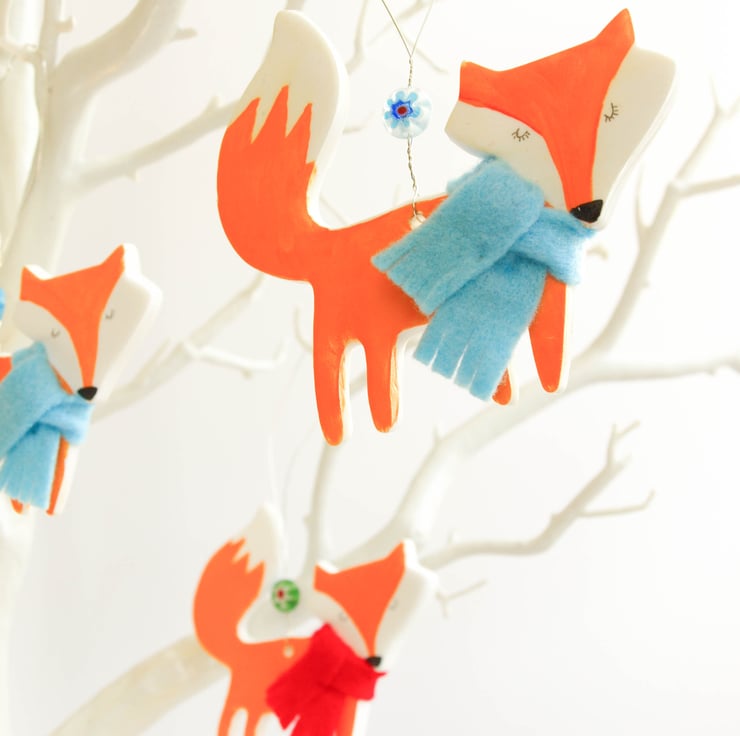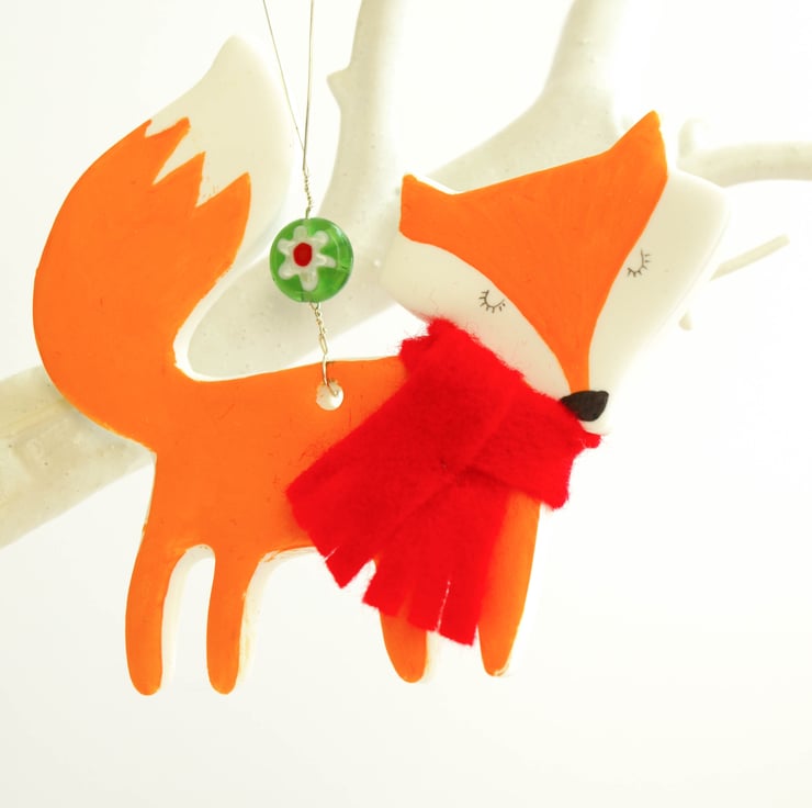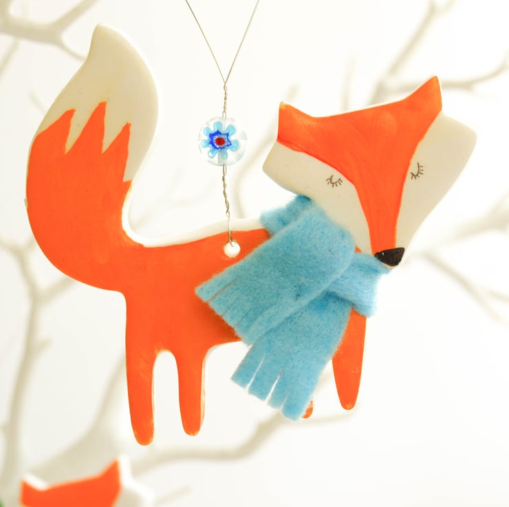 Each Festive Fox is hand cut from a piece of polymer clay then baked in a hot oven. Once cooled they are hand painted with acrylic, given a coat of varnish for protection then threaded with wire and a brightly coloured millefiori bead. The final touch is a cosy felt winter scarf in either red or blue!