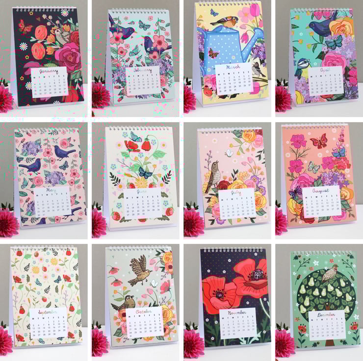 it is an A5 (148mm x 210mm) sized wire bound booklet style desktop calendar. This calendar is packed with colour and features pretty illustrations & patterns selected from my current collections - it is very much a walk through a beautiful English country garden, to make even the dullest workday a little bit brighter! At the bottom of each page is a section with all the dates for the month.