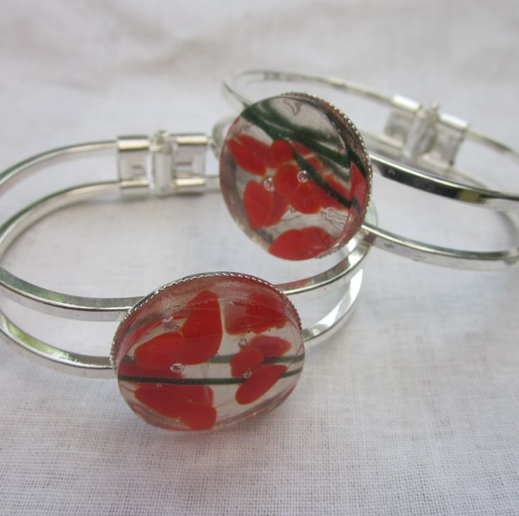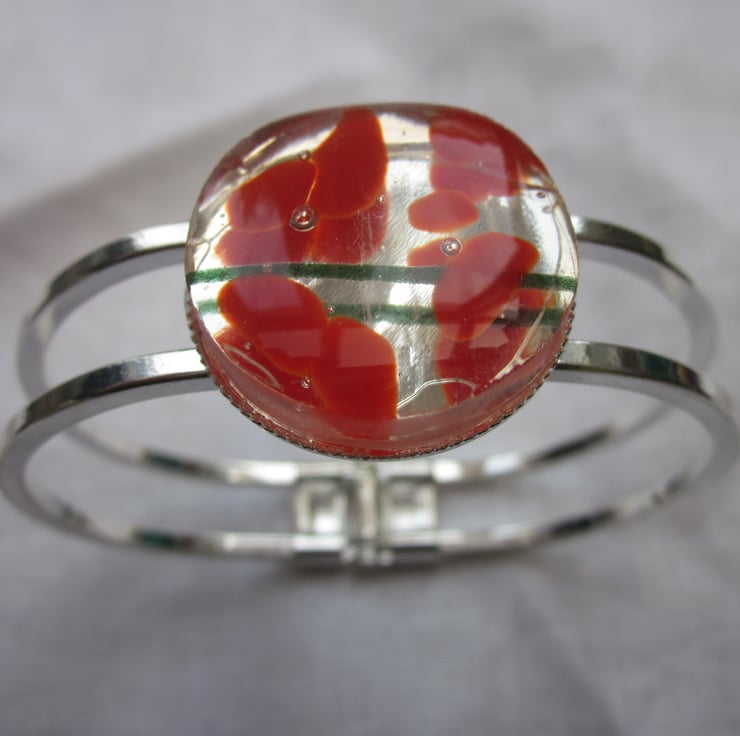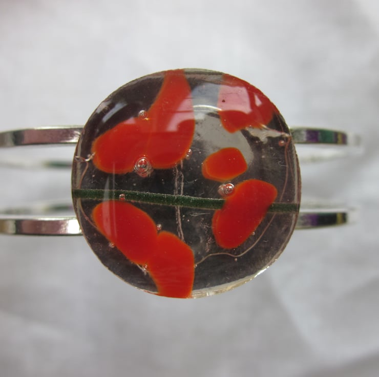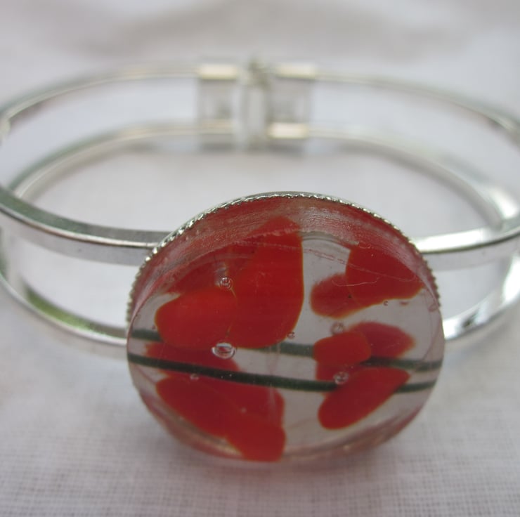 This cabochon has a pretty abstract poppy design on a clear base; it is approximate 1 inch/25mm round. This is set within a cabochon setting on a good quality silver plated spring bangle which has a circumference of 7 1/4 inches. The spring allows the bangle to fully open for ease of use.