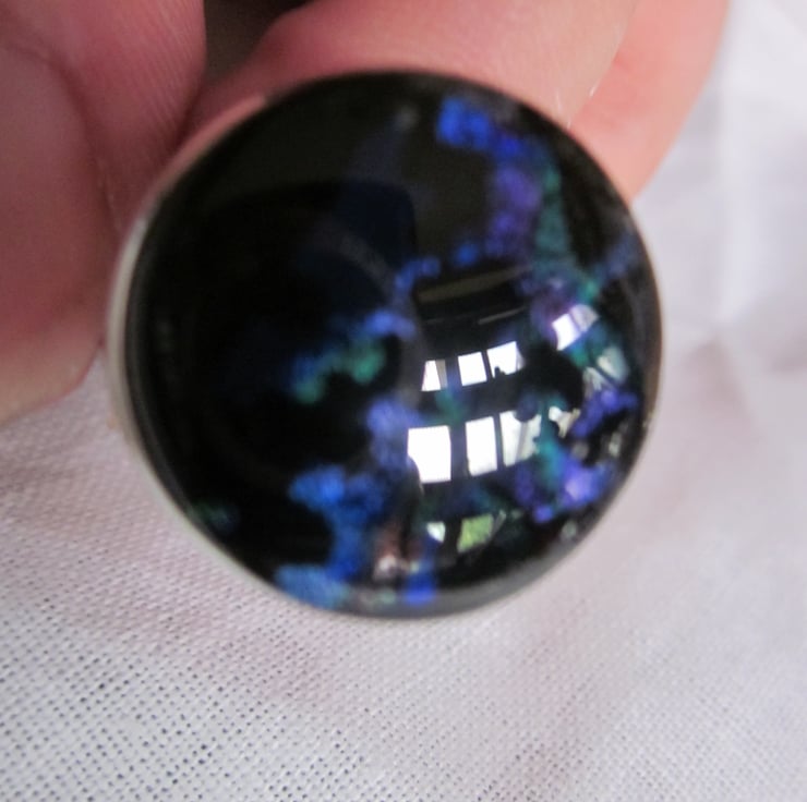 This cabochon has a beautiful purple dichroic steampunk design on a black glass base. It is fitted with a silver coloured metal adult sized adjustable cabochon ring. It is approximately 2cm diameter.