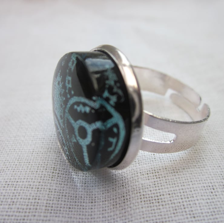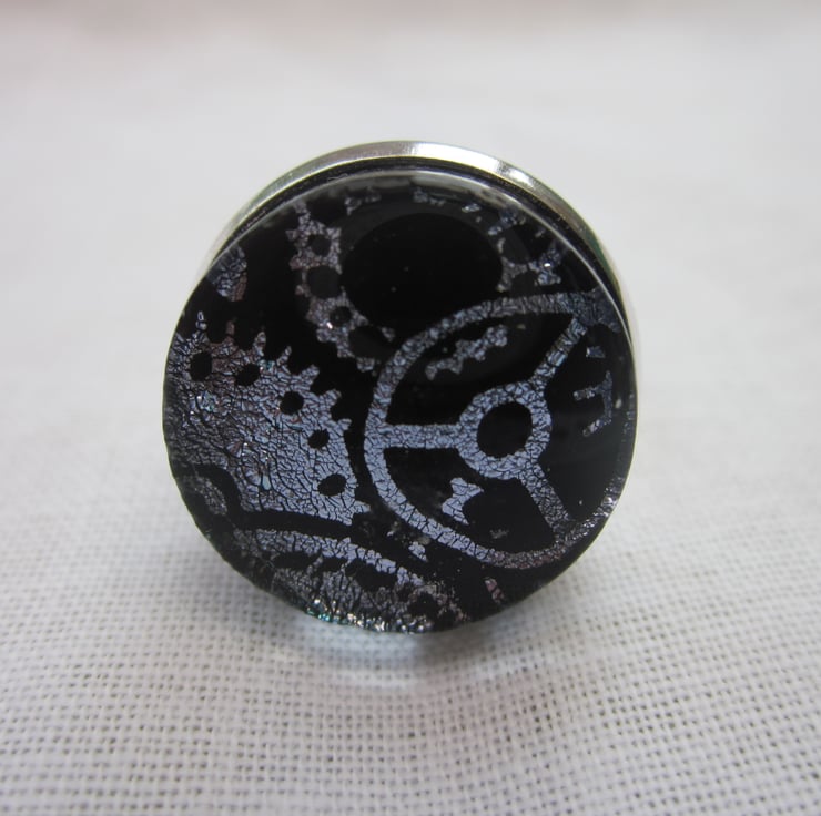 This cabochon has a beautiful silver dichroic steampunk design on a black glass base. It is fitted with a silver coloured metal adult sized adjustable cabochon ring. It is approximately 2cm diameter.