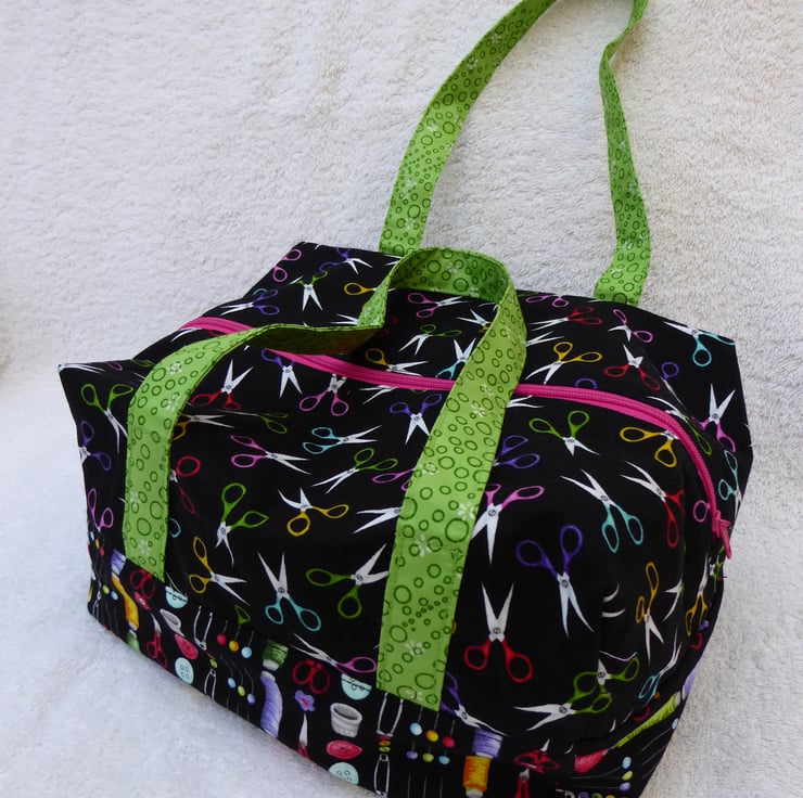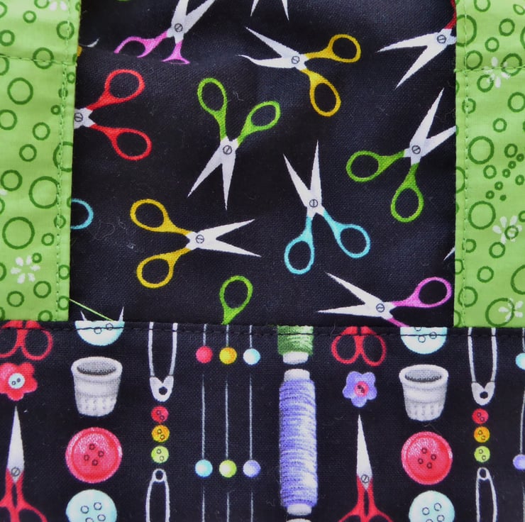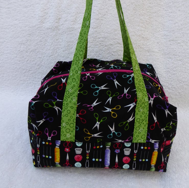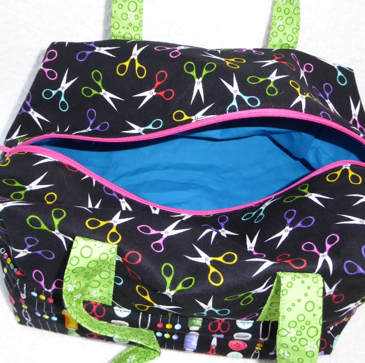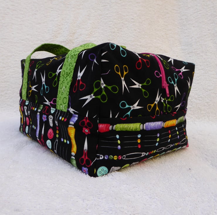 I have made this bright and cheerful sewing notions designed bag to hold small knitting projects or other sewing items.