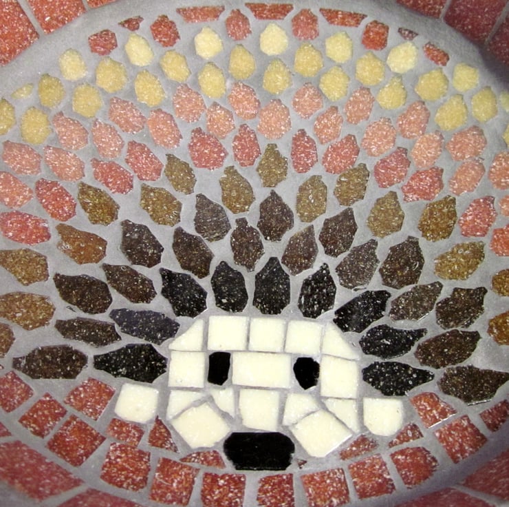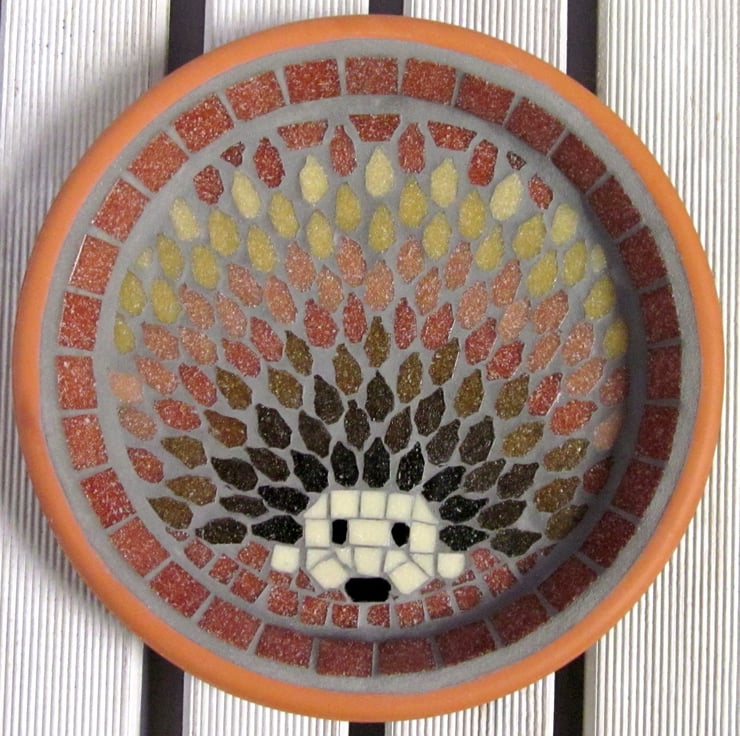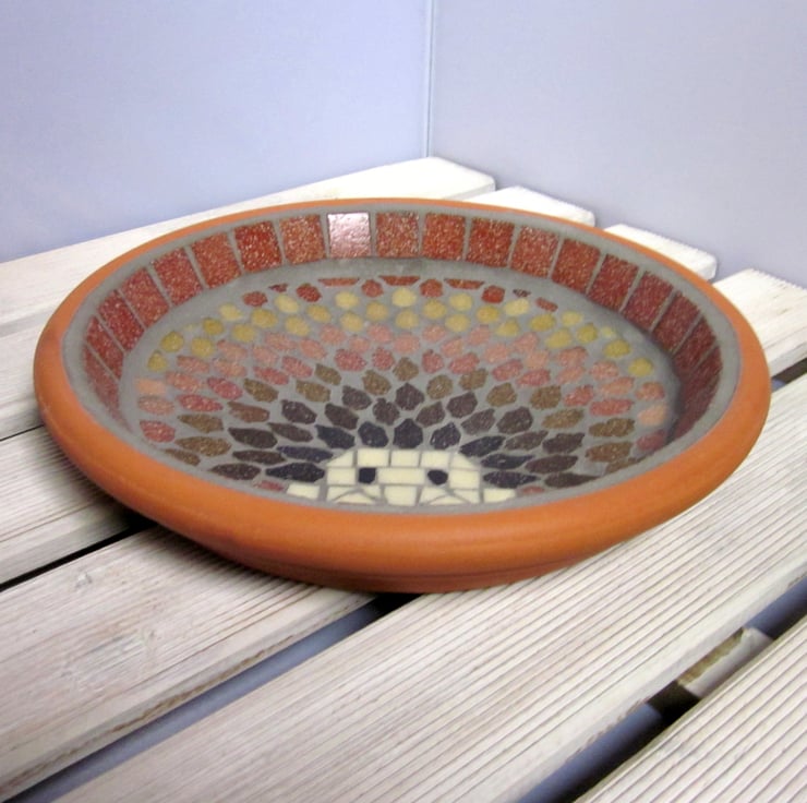 A mosaic bird bath with a hedgehog design using shades of browns, terracottas, and cream. The saucer is perfect to use as a shallow water dish to leave fresh water out for the hedgehogs in your garden at night, and will be used by your garden birds for bathing in the day. Great to add colour to the garden and a perfect gift for a gardener or wildlife lover.