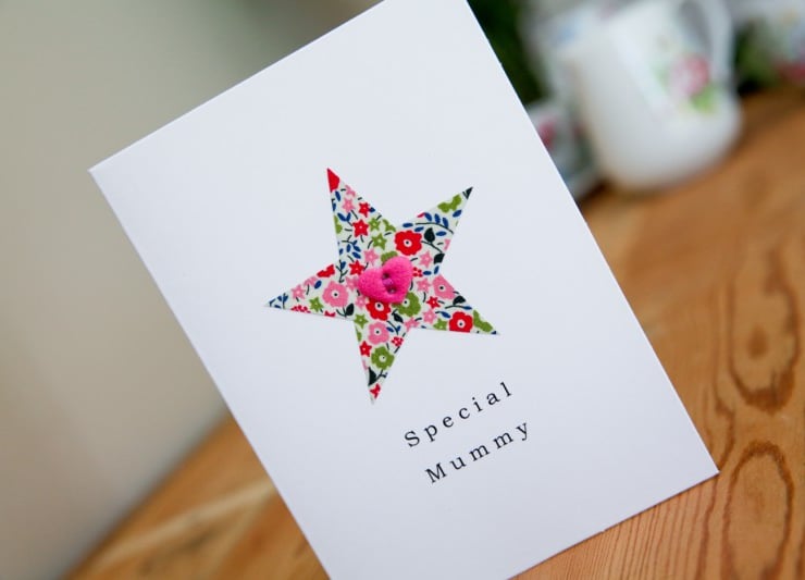 Handmade A6 greetings card featuring a beautiful Liberty print fabric star and felt button with the wording Special Mummy.