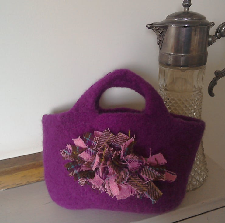 This pretty, purple handbag is made from 100% felted wool. It is trimmed on both sides with Harris Tweed in a pink and purple check which makes it unique and original. You can be sure you won't come across an identical bag.
