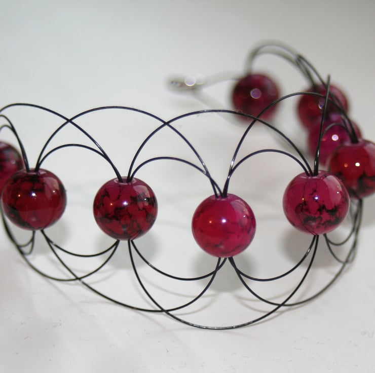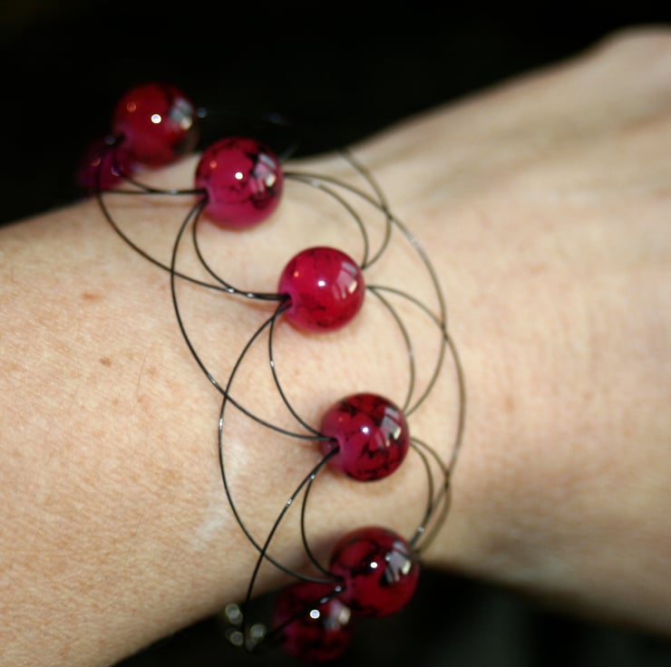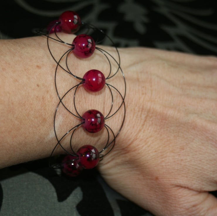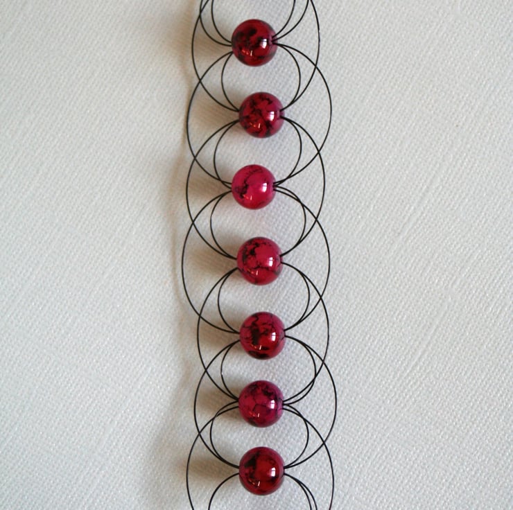 A unique and unusual cuff bracelet that is made with red glass beads surrounded by arcs of black beading wire. The beads have veins of black running through them. The bracelet fastens with a silver plated lobster claw clasp.