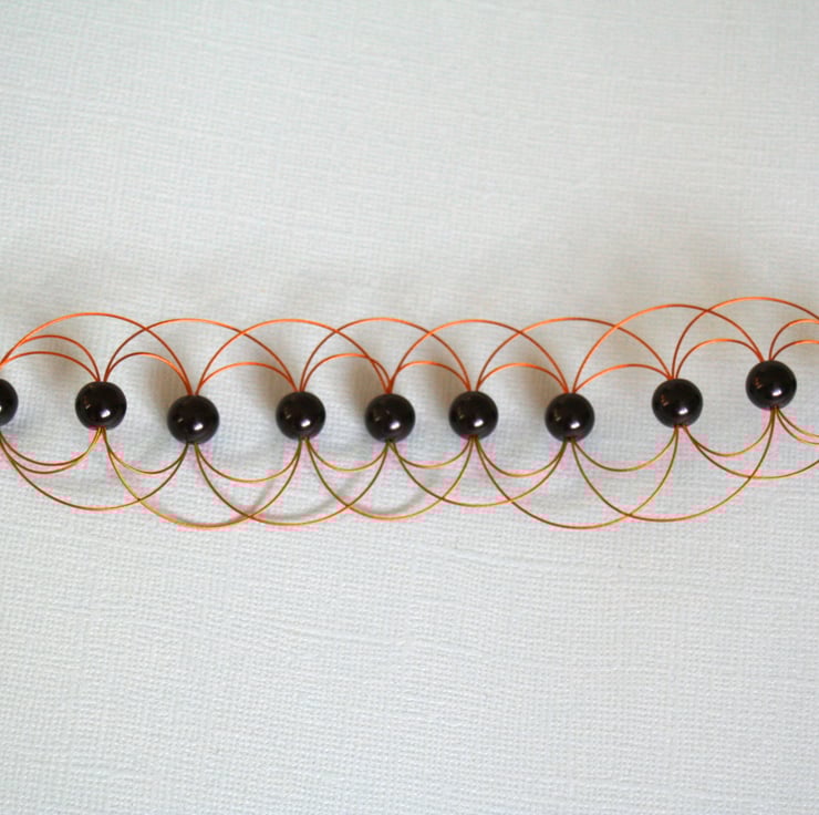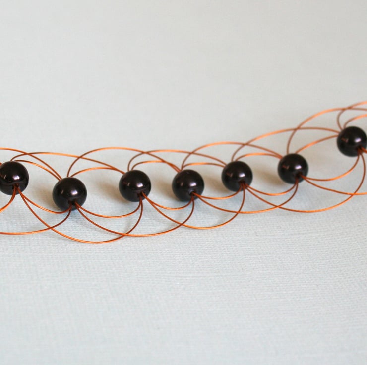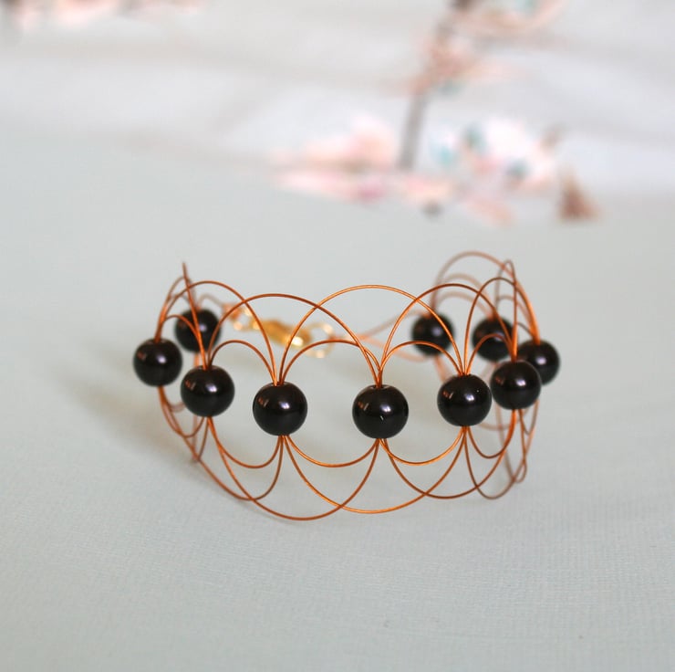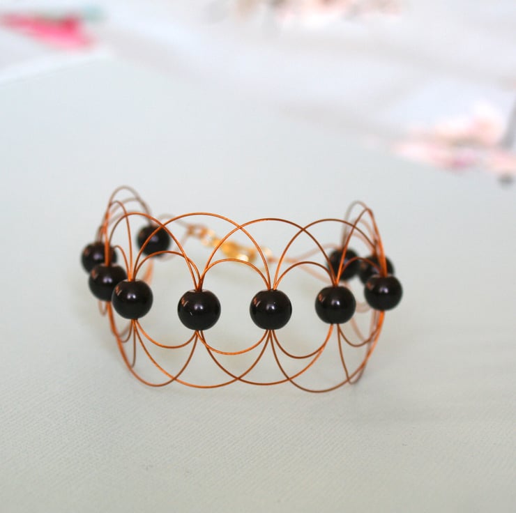 A dramatic cuff bracelet made with black glass pearls encased with arcs of gold beading wire. This is an elegant bracelet in a classic colour combination. The fastening is a gold plated lobster claw clasp.