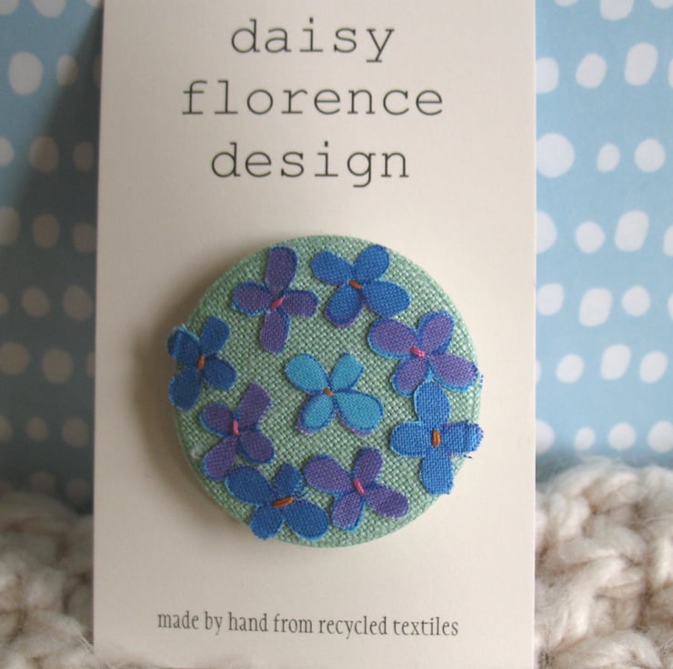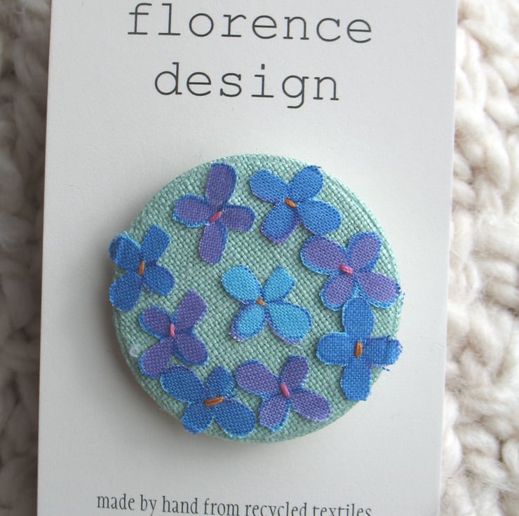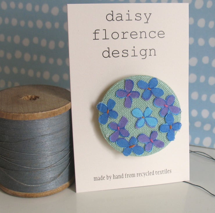 A hand-cut, hand stitched textile pin-brooch inspired by the hydrangea flower.