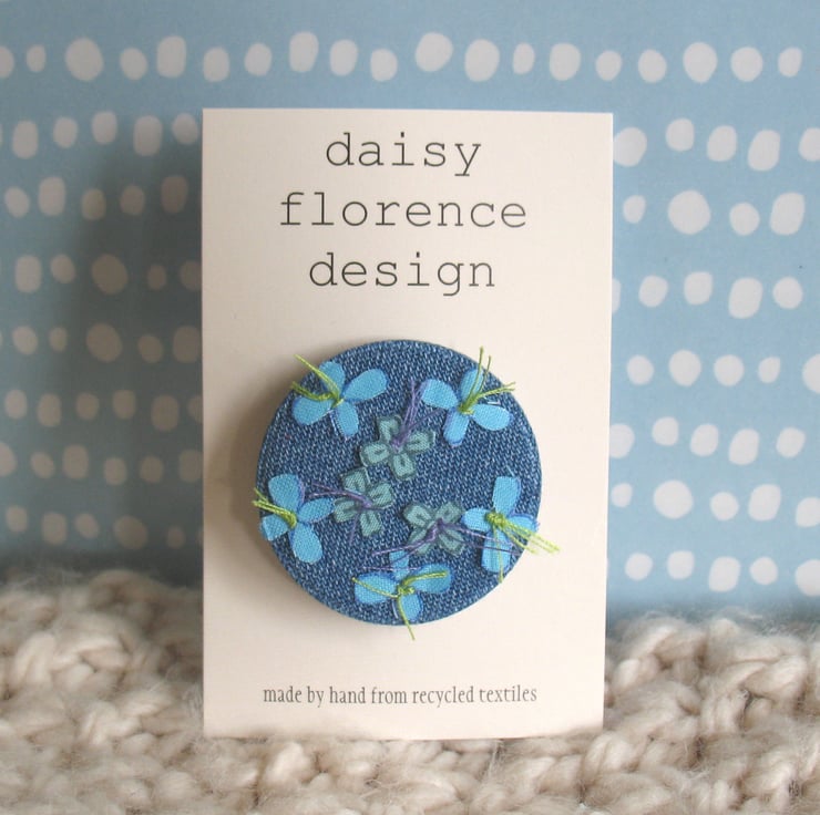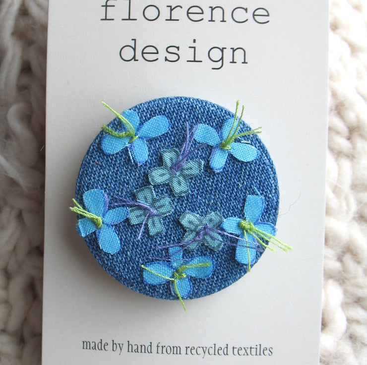 A hand-cut, hand stitched denim pin-brooch.