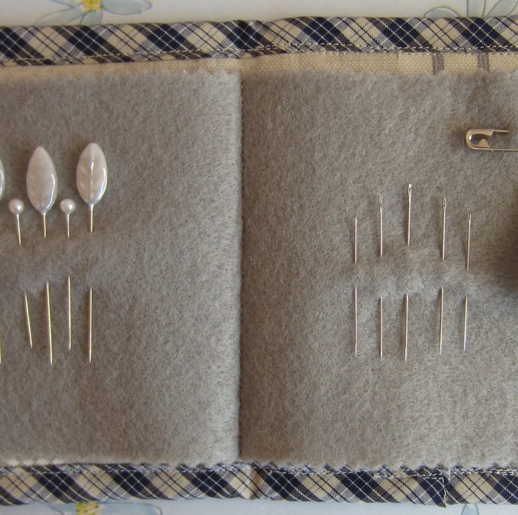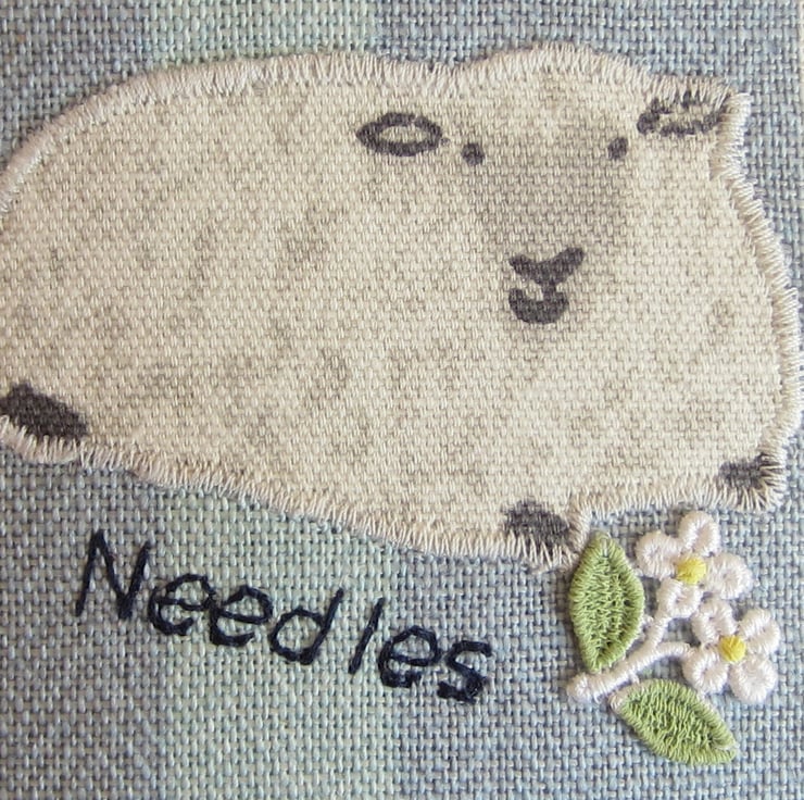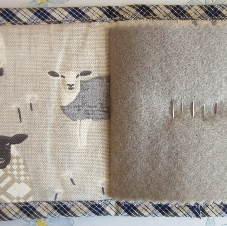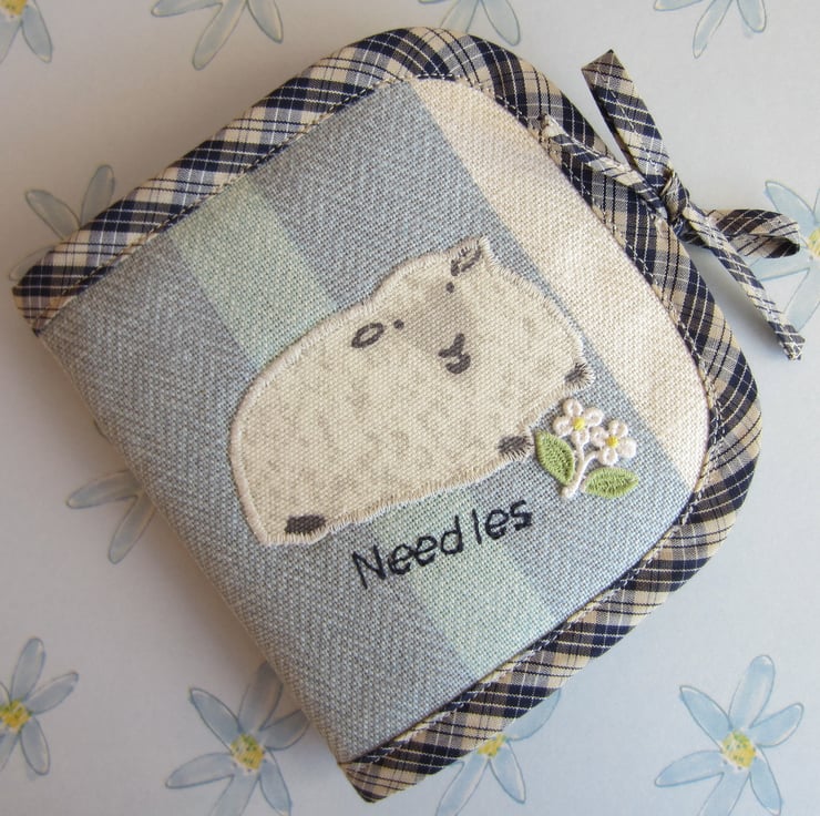 Lightly padded blue striped needle case with appliqued sheep and flower and leaf embellishment. Edged in blue check bias binding and lined with matching sheep fabric. Inside there is a grey felt page complete with pins, needles and threader. It measures 12.5 x 13.5 cm when closed and fastens with a bow at the side.